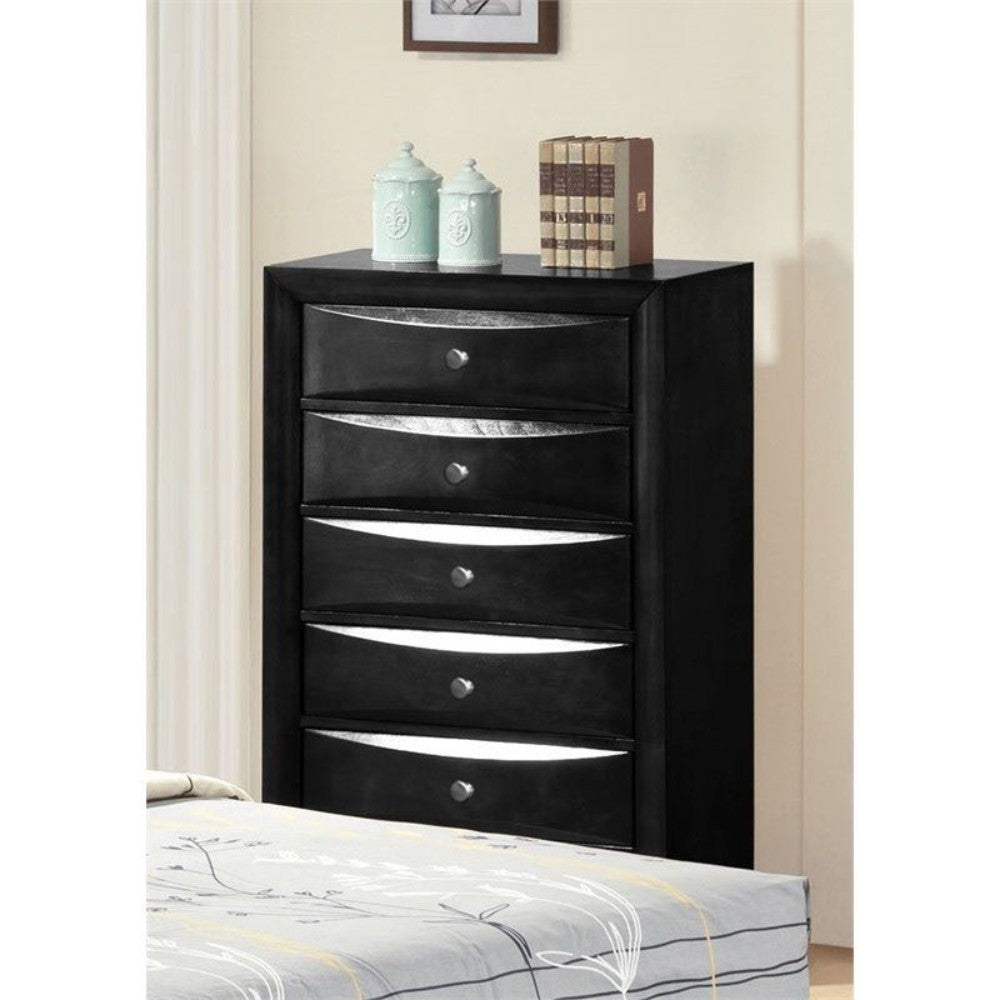 The Ireland chest in black finish with 5 spacious drawers will meet all of your bedroom storage needs, with space for clothing and linen. All drawers have English dovetail with center metal glides. Drawer fronts are beveled. Complemented by slightly flared square legs, the Ireland collection features contemporary feel and a modern black finish with shaped drawer fronts.
