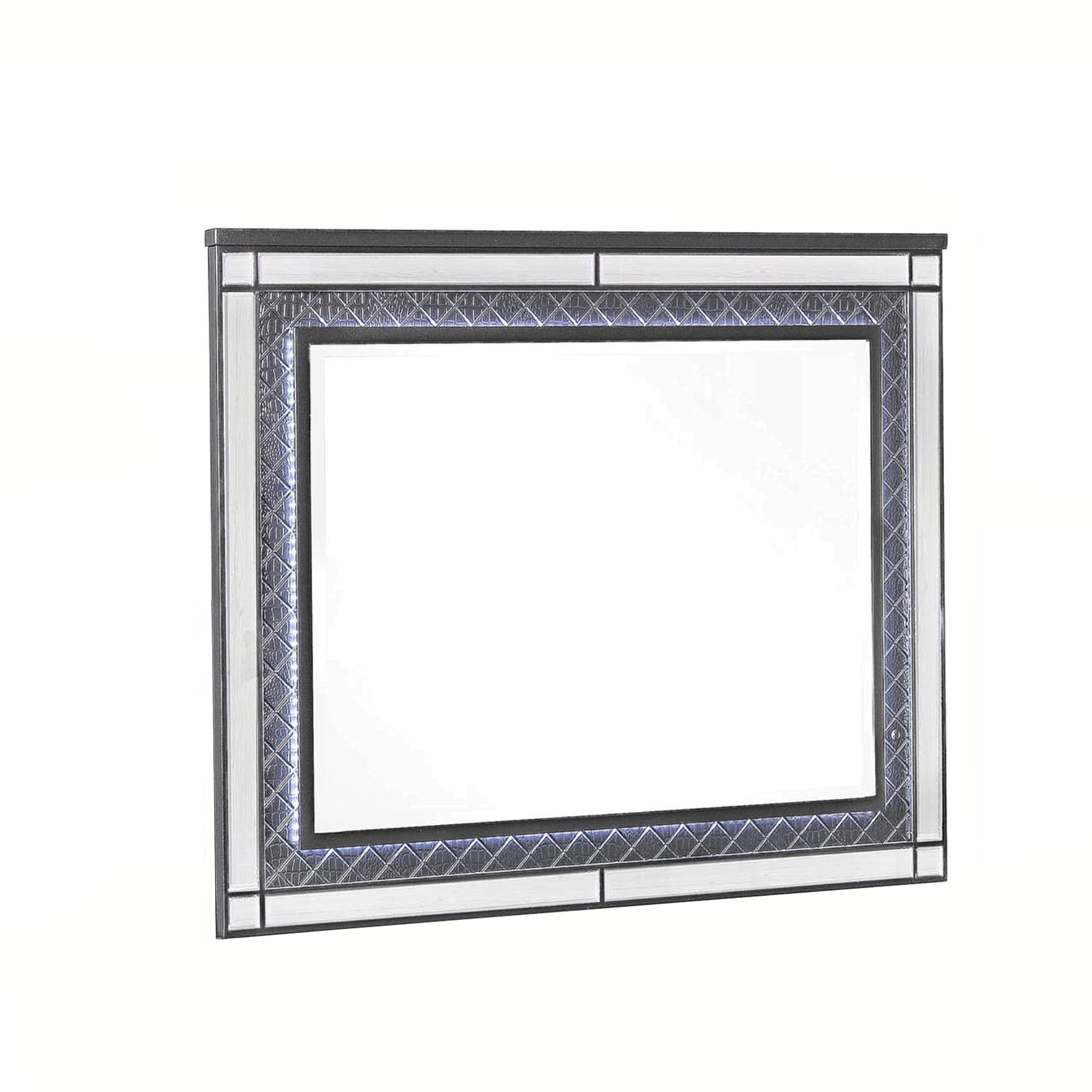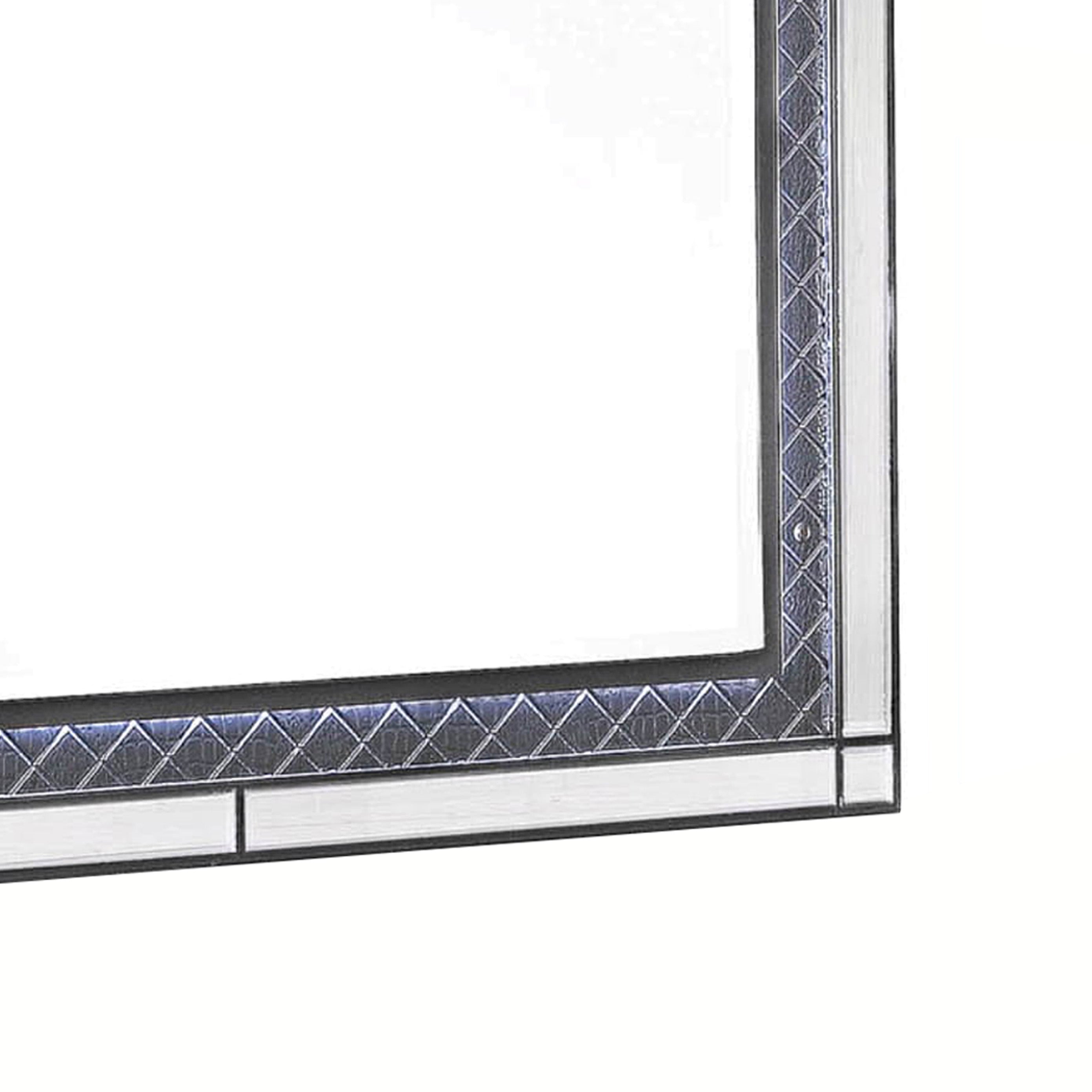 Featuring contemporary style, this sturdy wooden constructed mirror is here to add a tint of glam to your bedroom. The beveled edge mirror is accented with diamond pattern and mirror trim inlay at the sides. Incorporated with mounting hardware at back, it has LED light trim at edges to enhance its overall look.