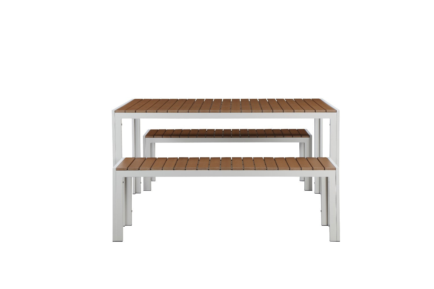 Now you can charm up your outdoors as well in the modern and trendy style with a huge range of outdoor, patio, terrace, frontyard and backyard furniture. Make your entire living space relaxed and comfy for dinners and brunches with this perfect collection of a sleek modern 3 piece dining set. This set consist of 2 benches and one dining table. Benches fit under dining table for storage. The framework of aluminium is durable alongwith classy Plastic lumber (Recycled Plastic) top. Dimension of Bench: L 53 in. X W 15 in. x H 18 in., Dimension of Table: L 59 in. X W 36 in. x H 30 in.