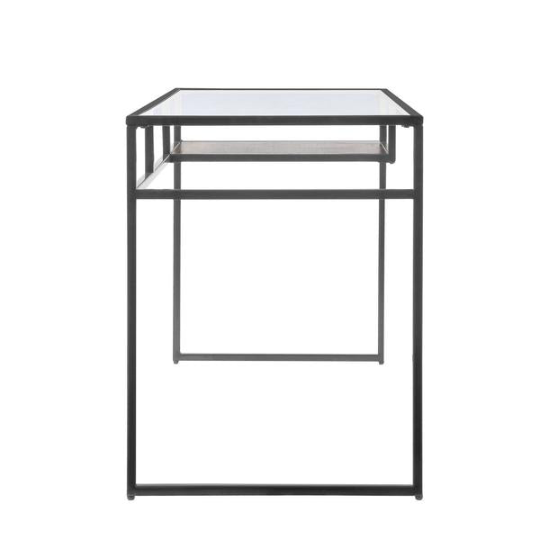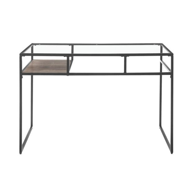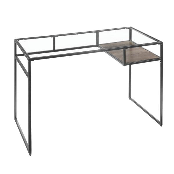 A perfect blend of industrial style with contemporary glam, this rectangular makes a great addition to your home office or study room. Exuding minimalism, it features a gray finished metal frame with sled base support, featuring an open compartment with a wooden shelf. The tempered glass tabletop adds to the elegance of the table.