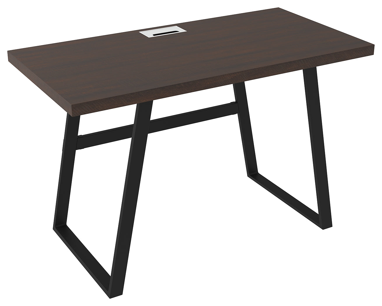 Work efficiently and hassle free in your office or home on this versatile writing desk. Constructed from engineered wood in Dark brown finish, it features a rectangular tabletop showcasing grain details, supported by a metal base in black finish. The tabletop features foldable slot for wire management.