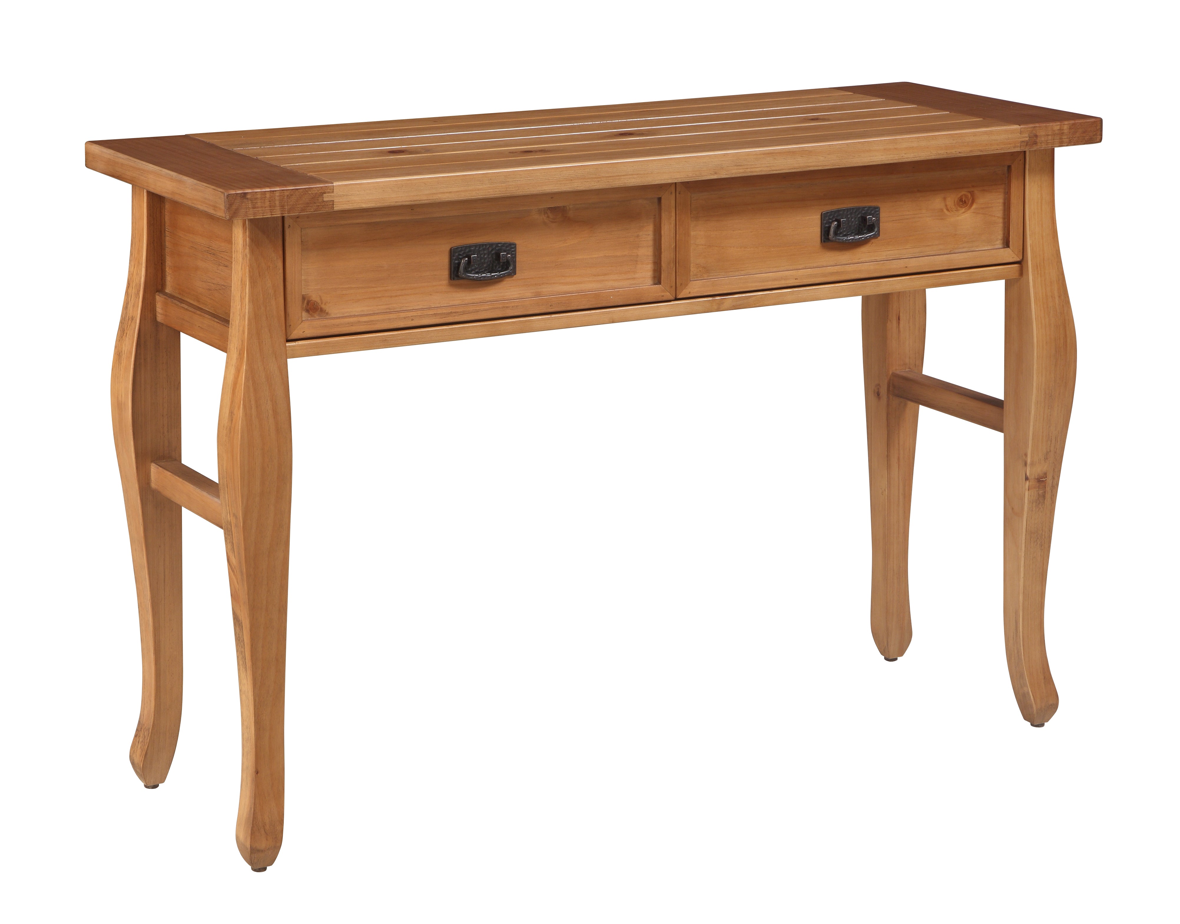 Enhance the decor of your living space with the addition of this traditional style console table. This rectangular shape console table is constructed from durable pineWood which is supported by sturdy curved legs that comes with floor protectors to save your floor from scratches. Polished in antique brown finish it comes with two spacious storage drawers to keep the small items within your reach. It comes with metal hammer pull accents as well.
