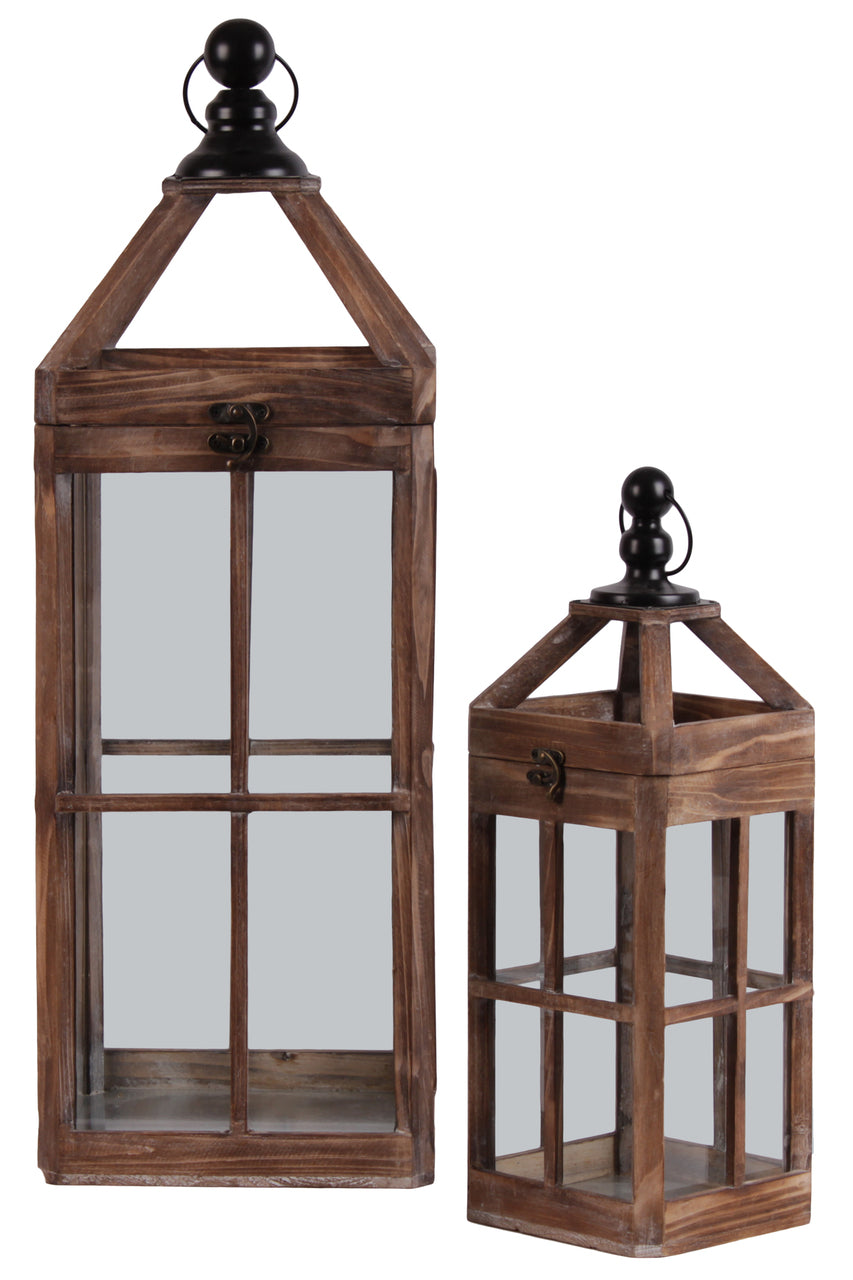 Create a warm inviting glow anywhere in your home with this wooden square lantern set. Wooden lantern is sturdily made with wood, metal and clear glass, can used for indoor and outdoor decoration. This set also features metal round finial on top with attached sturdy ring for easy hanging on wall sconce or outside on a hook. This lantern set is perfect for a centerpiece, mantle, or any tabletop decoration. This wooden Lantern set comes in 2 different sizes allow you to create an instant interest to your home indoors and outdoor area.