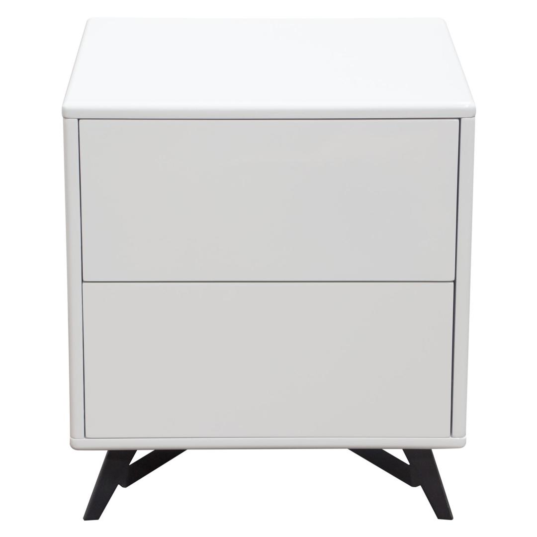 Add a touch of style and texture to any room in your home with this end table. Made up of wood, this white glossy finish end table features flat table top with two spacious drawers having push back release function and slanted black powder coated metal feet. The table top can be adorn with vases, books, lamps and other Decorative items while drawers are spacious to keep and store all kinds of stuff. Perfect to use in your living spaces and will easily blends with all Decor styles. This end table can also be used as a side table or as a night stand in your bedroom.