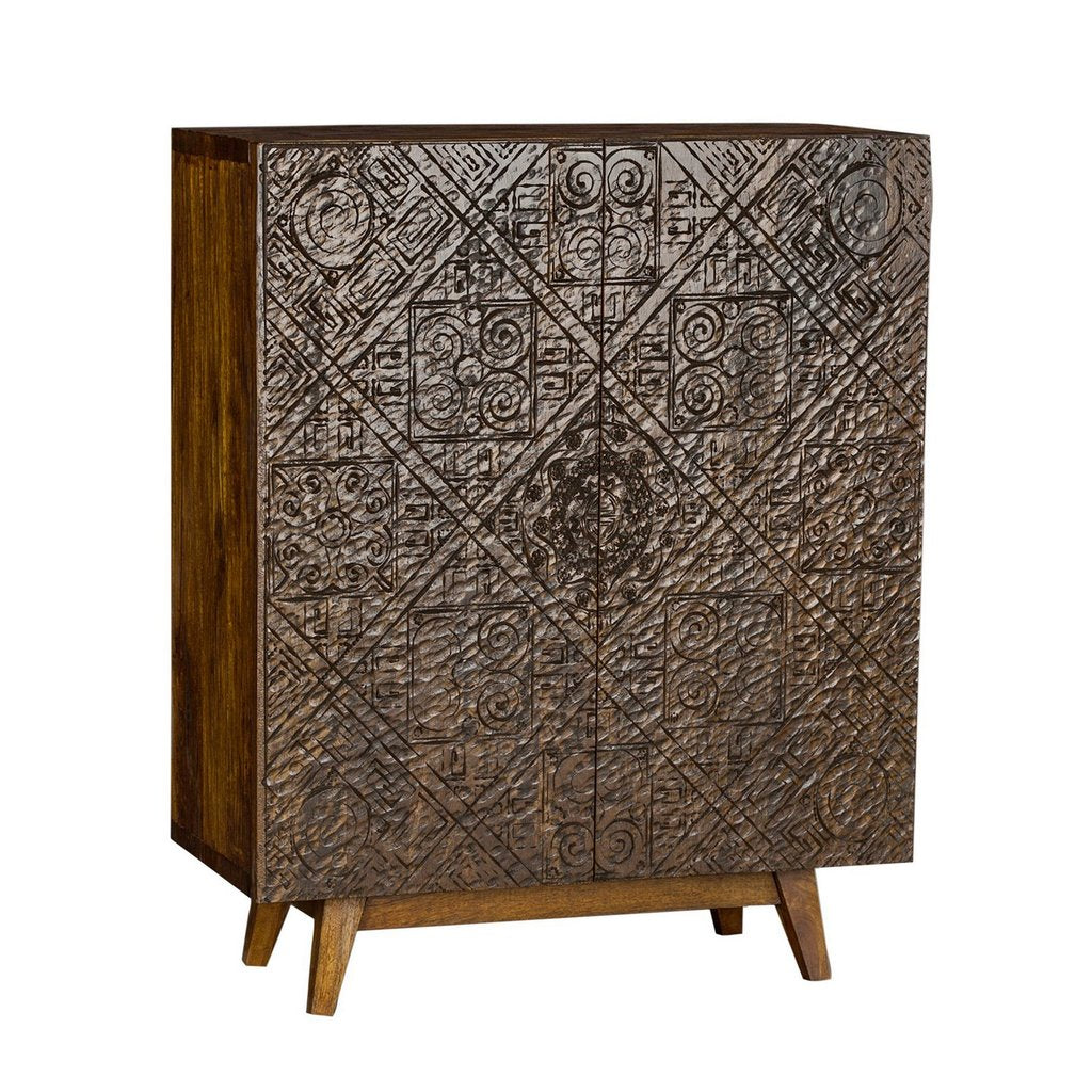 Add rustic appeal to your furnishing with this beautifully designed Cabinet. Rectangular in shape, it showcases a geometric carved front panel with two doors. The solid wood construction imparts durability, while the angled tapered legs add to the stability and style.