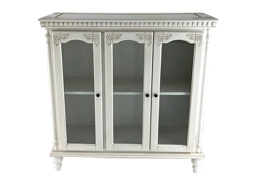 Add a touch of traditional flair to your interior space with this Accent Cabinet that has been made up of BirchWood, this white finished cabinet features beautiful carved details, turned side posts, bun feet and 3 glass doors that open to reveal shelves inside