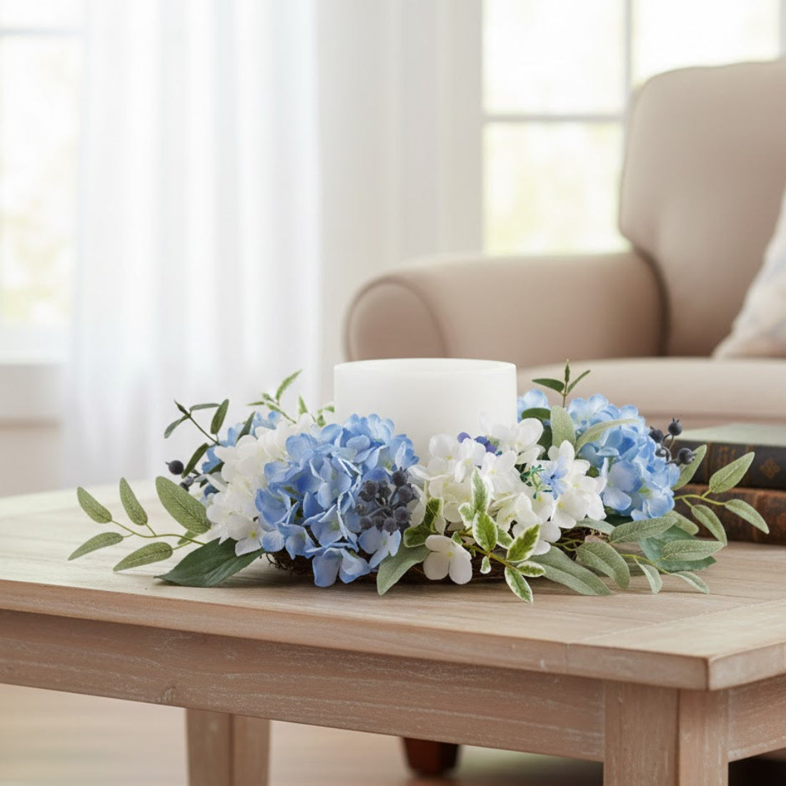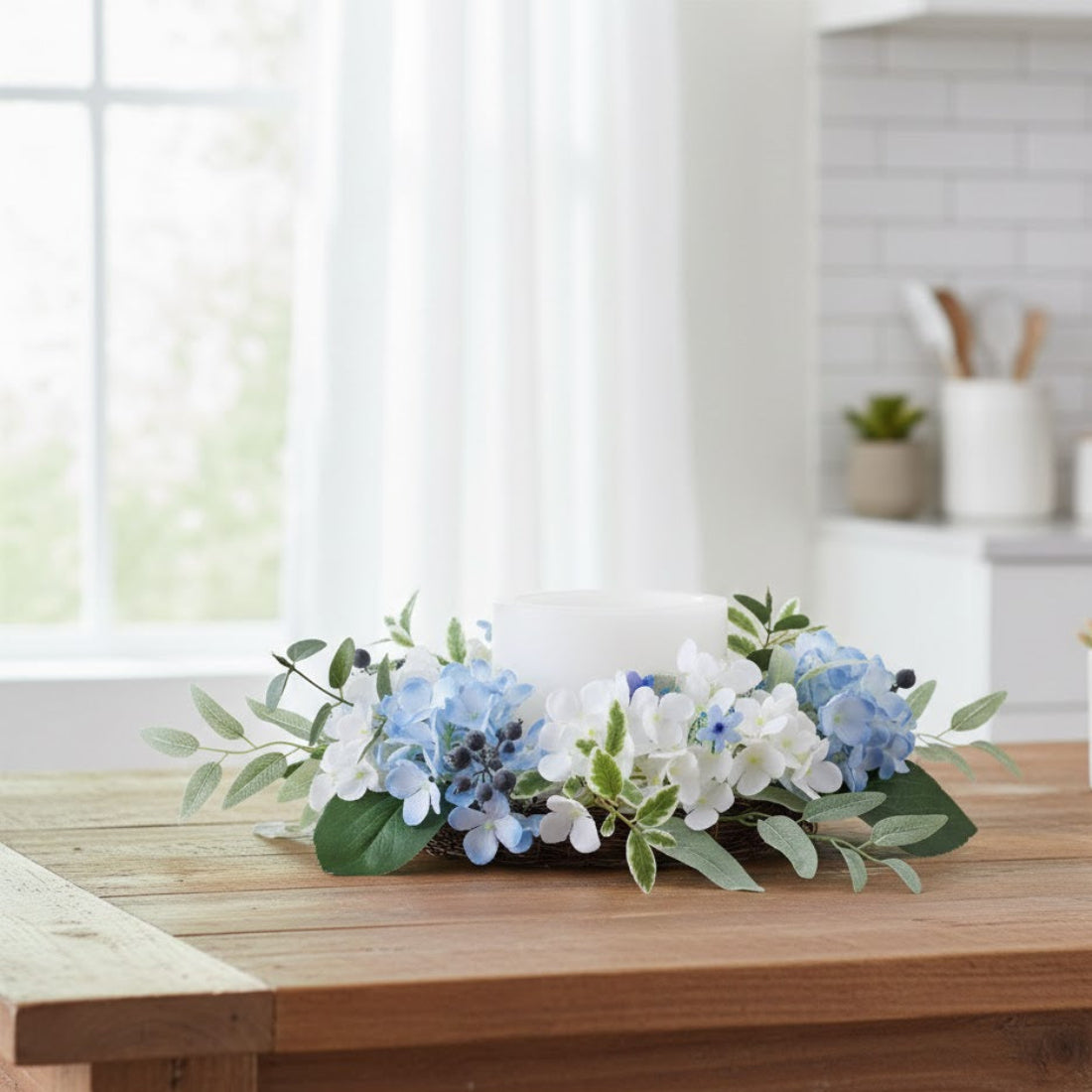 8in Faux Hydrangea Candle Ring – Mixed Green and Blue Florals by Melrose
