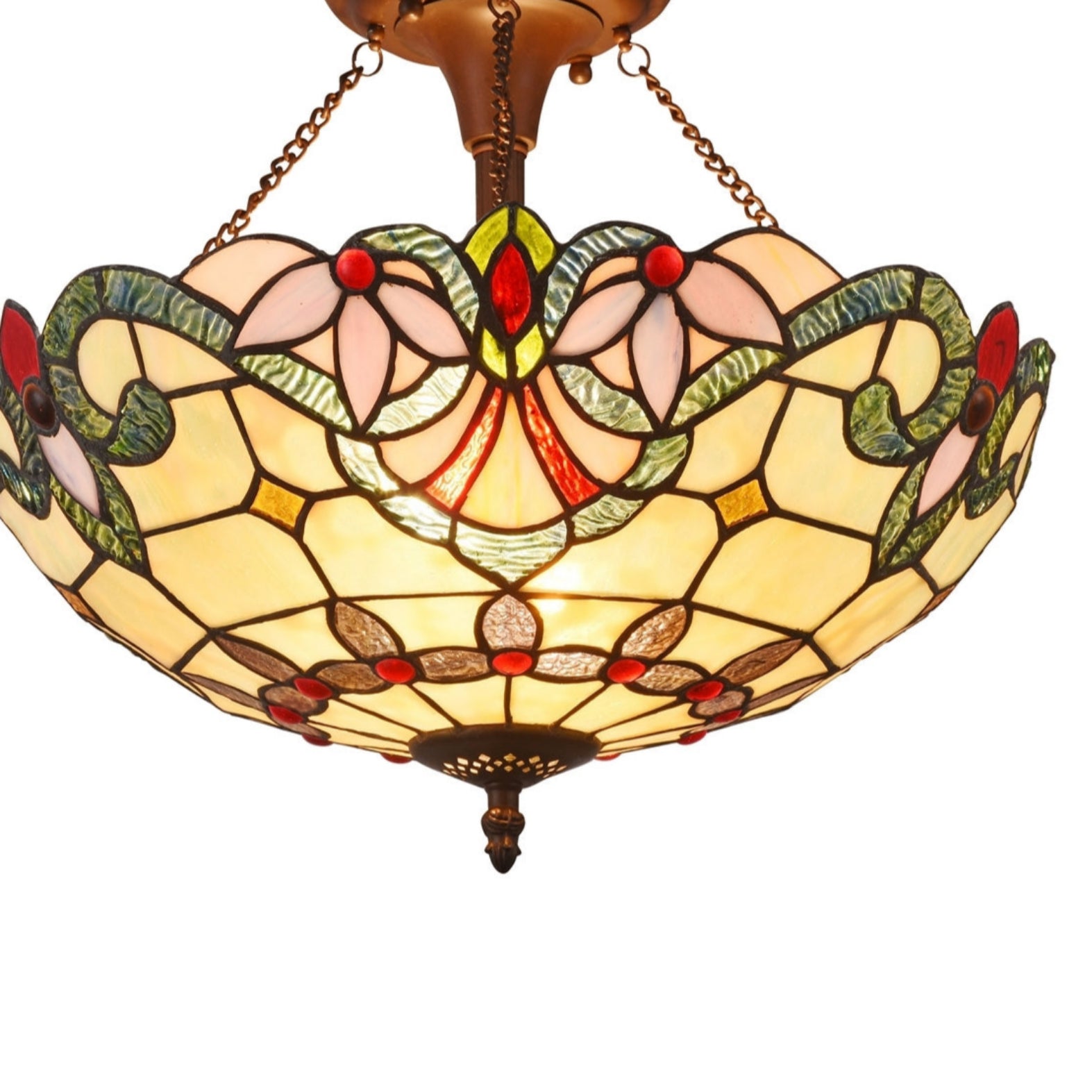 COOPER, a Tiffany-style 2 light semi-flush ceiling fixture is the perfect addition for your home, featuring a very garden-like scene. Hand crafted from over 220 pieces of art glass and 21 beads that will add color and beauty to any space. Main colors are red, green and yellow. Handcrafted using the same techniques that were developed by Louis Comfort Tiffany in the early 1900s, this beautiful Tiffany-style piece contains hand-cut pieces of stained glass, each wrapped in fine copper foil.