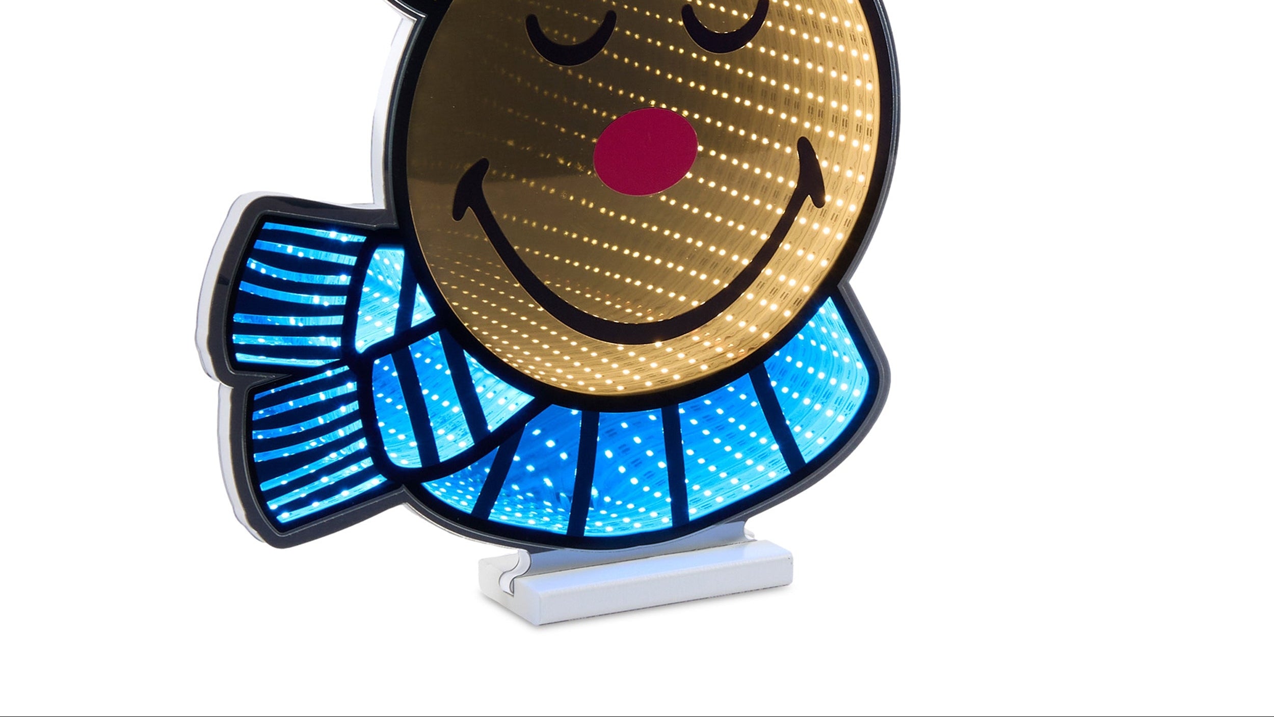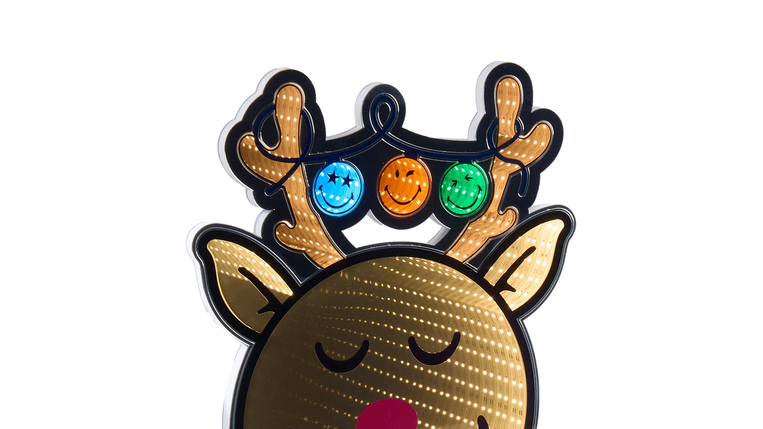 This Smiley Reindeer Ekkolight brings a bright holiday accent to indoor spaces with its cheerful expression and colorful details. Made from Acrylic, PET Plastic, and EVA Foam, it offers a durable yet lightweight structure that is easy to hang or place along walls and entry areas. The UL approved plug ensures consistent and dependable lighting throughout the season. Its slim 1 inch depth allows it to fit comfortably in narrow locations while maintaining a bold visual impact. Featuring brown, blue, and green coloring, this piece complements festive holiday settings. Dimensions are 16.5 inches long, 1 inch wide, and 21 inches high.