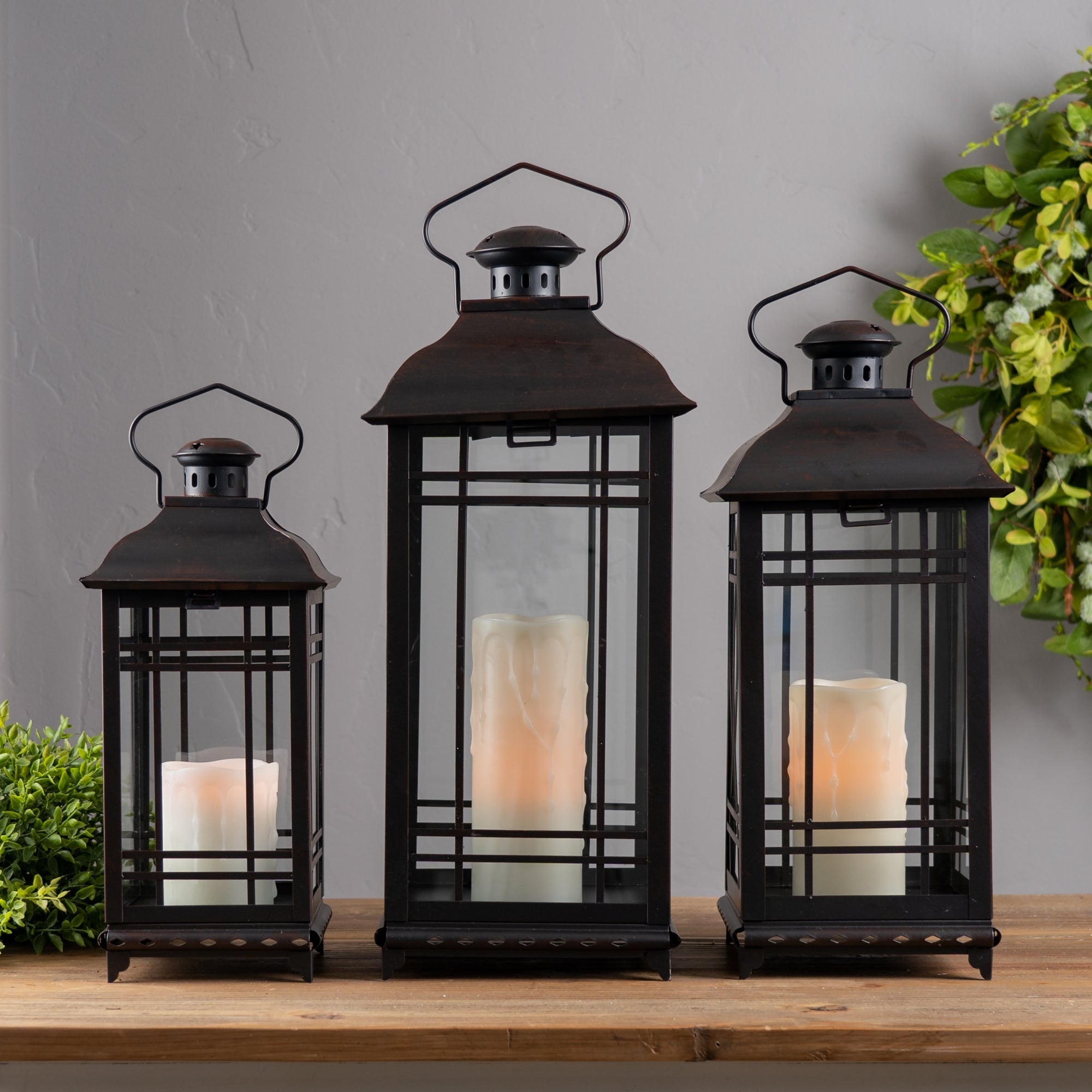 Enhance your home with the timeless look of this black metal lantern set, featuring three sizes crafted from durable metal and clear glass. Designed with clean lines and a classic shape, these lanterns offer versatile styling for living rooms, entryways, dining tables, or covered outdoor spaces. Use them with LED or wax candles, or fill them with seasonal accents for year round decorating. The set includes three sizes measuring 8.5"L x 8.5"W x 20"H, 7.5"L x 7.5"W x 17"H, and 6.25"L x 6.25"W x 14"H, allowing you to create layered displays with depth and dimension. A dependable decor option, these lanterns bring warm ambiance to any setting.
