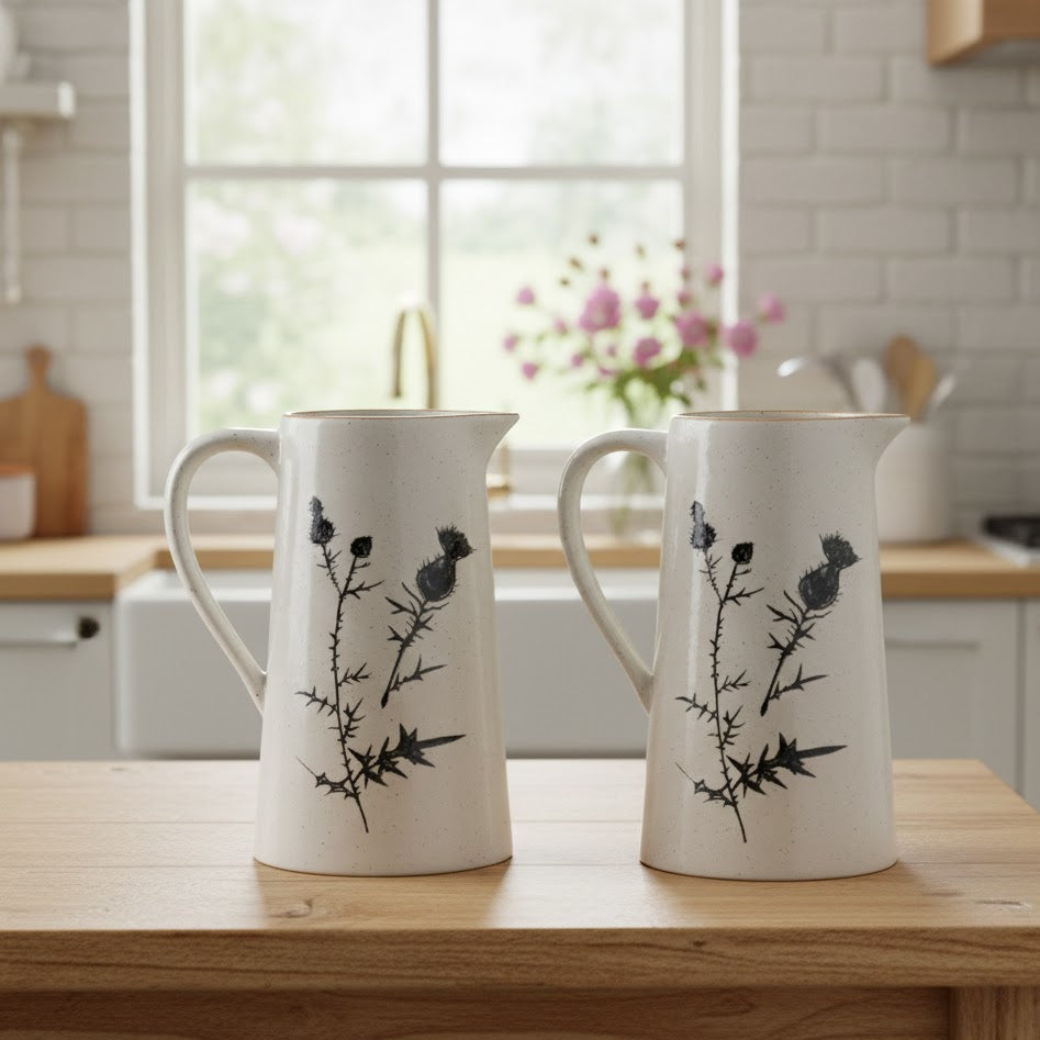- Set includes two ceramic pitcher vases with matching etched detailing