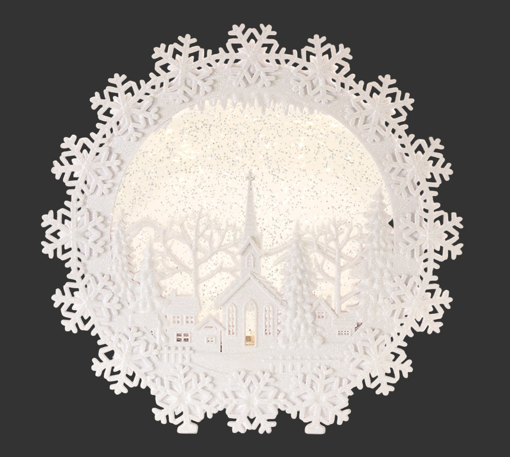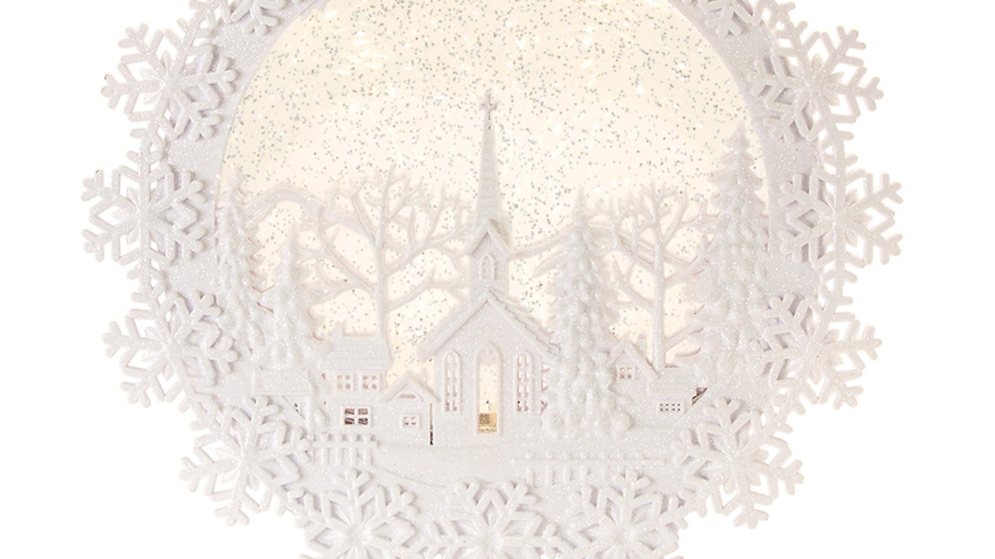 By Melrose Church Scene Snow Globe, 12.25"H, crafted from durable plastic with soft LED lighting to create a warm, festive glow. The globe features a charming church scene, bringing cozy holiday cheer to any indoor tabletop or mantel. Includes a 6-hour automatic timer for daily, hassle-free illumination. Can be powered by 3 AA batteries (not included) or USB cord, offering versatile placement throughout your home. Perfect for indoor use, this snow globe combines festive imagery with gentle illumination to enhance your Christmas décor. Lightweight and easy to display, it is ideal for gifting, holiday hosting, or seasonal decoration. Dimensions: 12 x 2 x 12.25".