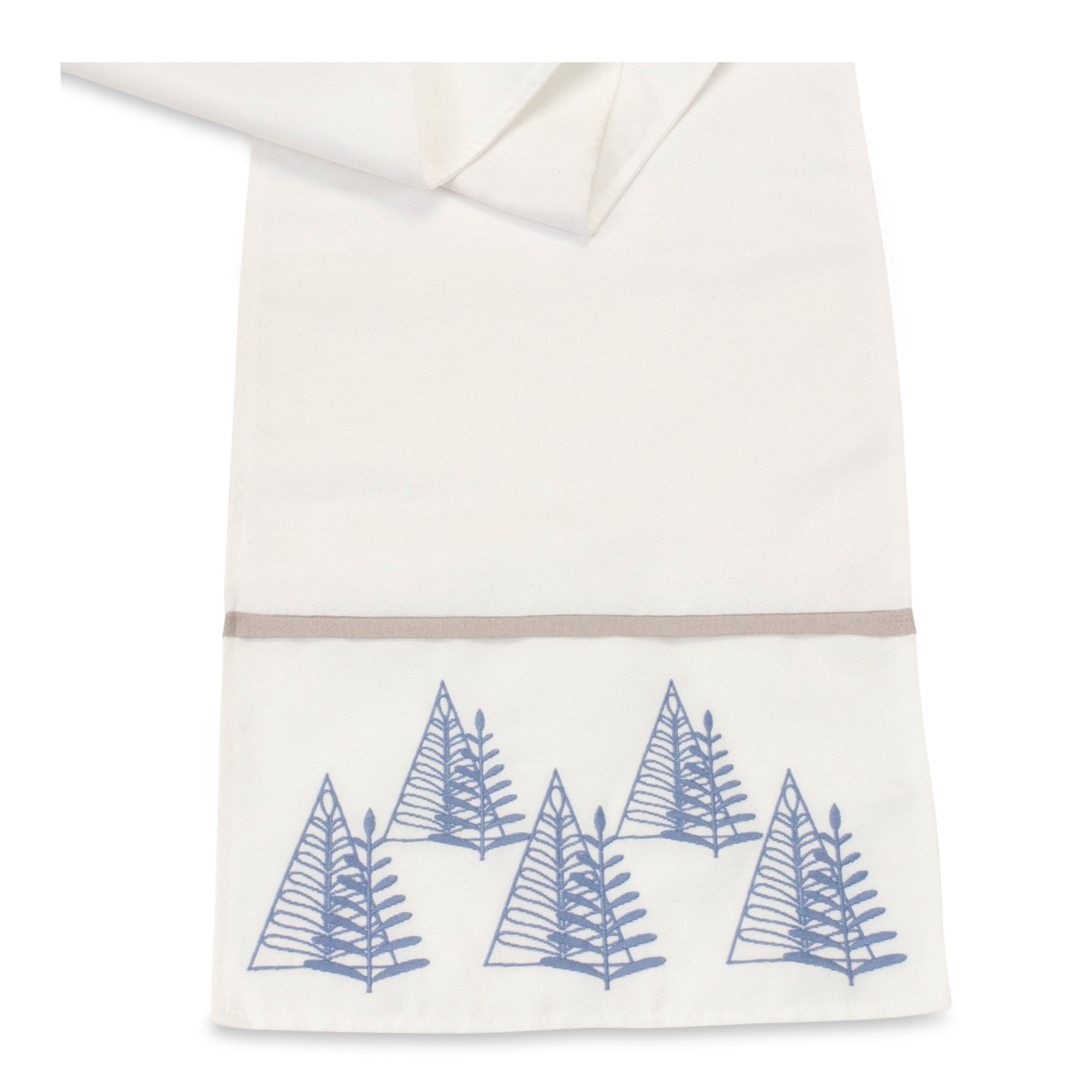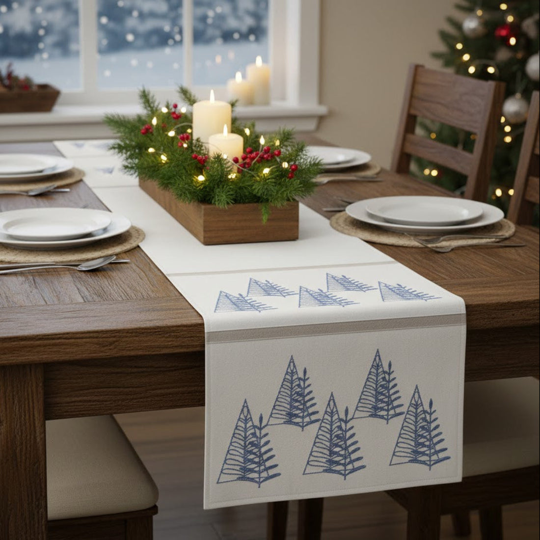 christmas dining table linen,christmas table runner,christmas tablescape accessory,embroidered polyester runner,festive dining runner,festive table accent,holiday buffet table runner,holiday dining decor,indoor holiday table decor,seasonal table decor,tree embroidered table runner,tree pattern table runner,white blue table runner,winter holiday table runner