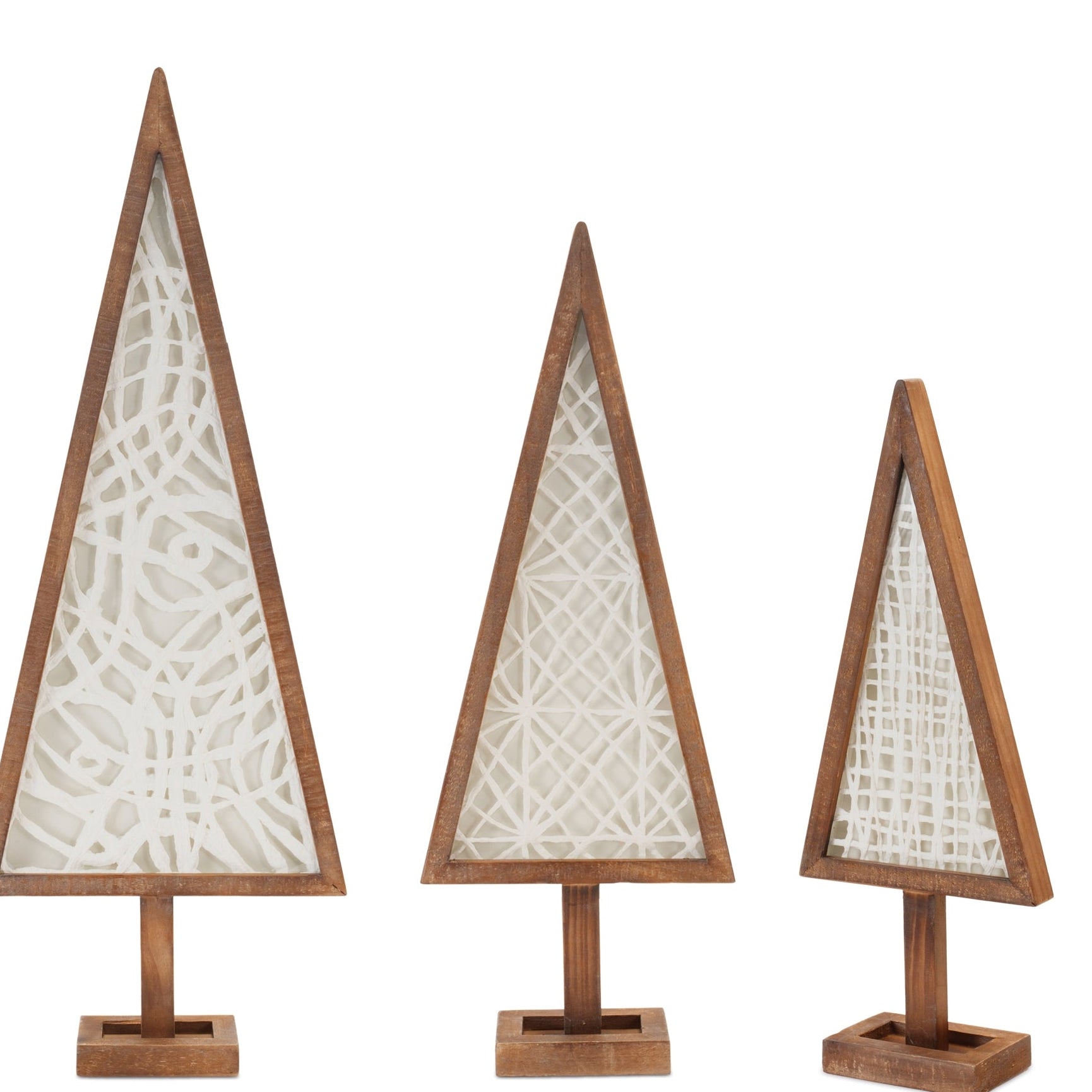 Add layered warmth and rustic elegance to your holiday décor with the Framed Paper Mache Pine Tree Set by Melrose. This beautifully coordinated set of three tabletop trees features modern pine silhouettes accented with paper mache details and framed in natural wood grain finishes. Crafted from fir wood and MDF, each piece blends earthy textures with clean, contemporary lines, making it ideal for rustic, farmhouse, or woodland-inspired holiday styling. Display them together on a mantel or console for visual impact, or style individually on shelves and tabletops to create a cozy seasonal atmosphere.