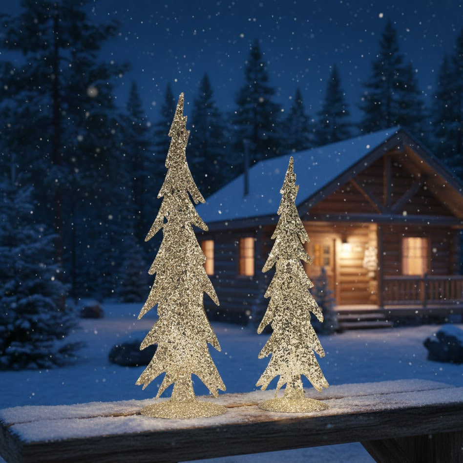 This set of two Gold and Silver Mosaic Pine Trees brings a modern and elegant touch to your holiday decorating. Crafted from durable iron with a shimmering mosaic glass look, each tree reflects light beautifully to create a warm, festive glow. The larger tree measures 5 inches long, 5 inches wide, and 17.25 inches high, while the smaller tree measures 4 inches long, 4 inches wide, and 13.5 inches high. Perfect for mantels, dining tables, shelves, and entryways, these trees add sophistication and seasonal charm to any display. Their sleek metallic tones pair easily with contemporary or traditional holiday themes, making them a timeless accent for your winter decor.