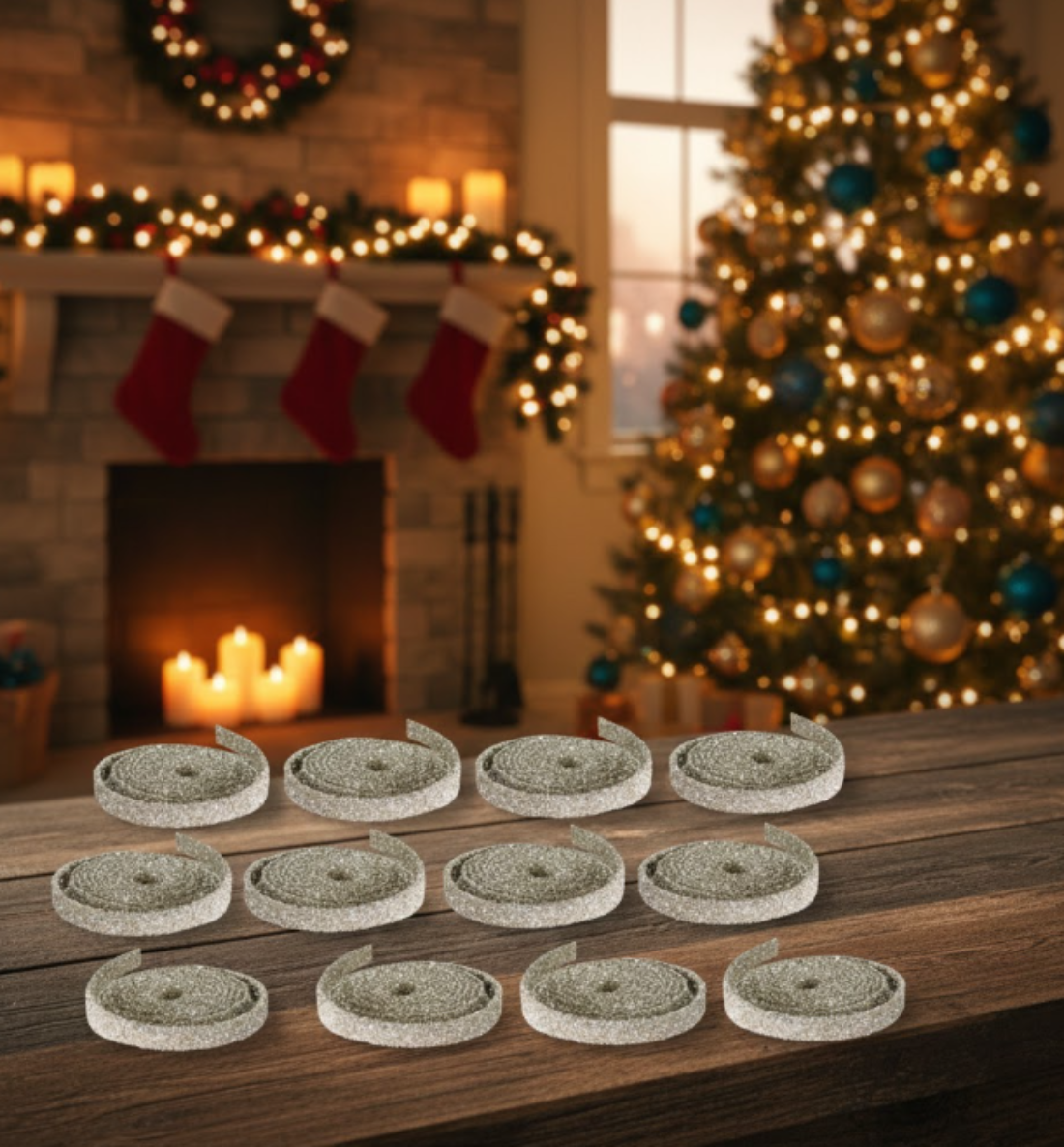 This Champagne Glitter Rope Ribbon set adds a soft, shimmering touch to holiday decorating and crafting. Each set includes twelve 1-inch by 15-foot rolls made from durable plastic with a flexible wired structure that shapes effortlessly into bows, garlands, and decorative accents. The champagne-colored glitter finish provides an elegant, festive glow ideal for wreaths, Christmas trees, gift wrapping, tablescapes, and seasonal home décor. Lightweight and easy to use, this ribbon offers both versatility and long-lasting style for all your creative projects. With generous length and a refined color palette, it’s perfect for enhancing holiday displays or crafting custom designs with a polished finish.