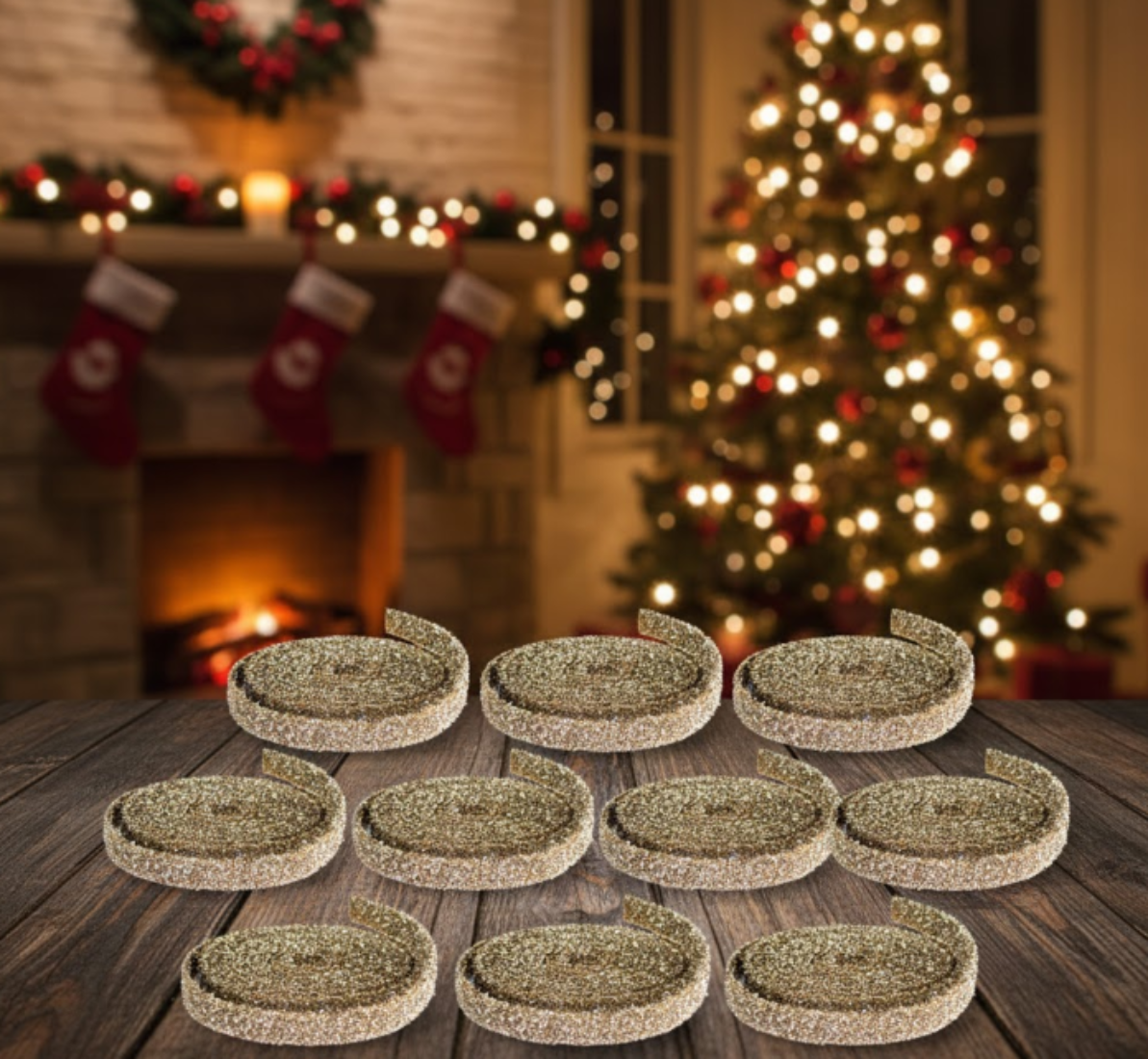 This Gold Glitter Rope Ribbon set brings a bright, festive shine to your holiday decorating and crafting projects. Each set includes twelve 1-inch by 15-foot rolls made from durable plastic with a flexible wired structure that shapes easily into bows, garlands, and detailed accents. The metallic gold finish paired with shimmering glitter adds a glamorous touch to wreaths, Christmas trees, gift wrapping, and seasonal home décor. Lightweight yet sturdy, this ribbon is ideal for both everyday crafting and creating eye-catching holiday displays. With ample length and versatile styling potential, it’s a must-have addition to any festive crafting collection.