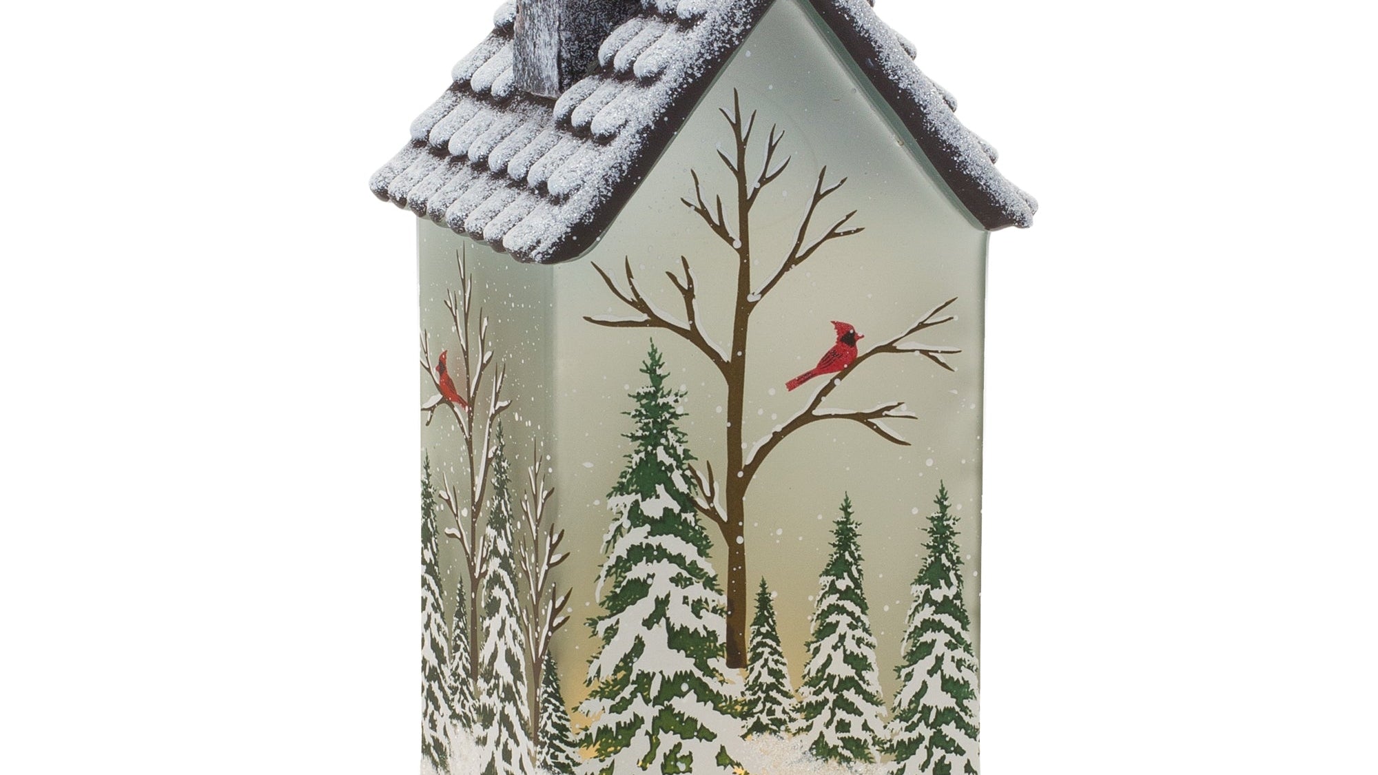 This LED lighted house figurine set features frosted glass construction with hand painted pine trees and a vibrant cardinal for a bright winter look. Each piece provides a soft warm glow that enhances mantels, shelves, or tabletop displays during the holiday season. The set includes two matching houses crafted for indoor decorating and designed to create a balanced visual arrangement. Each house requires two AAA batteries (not included), allowing flexible placement without the need for a power outlet. The figurines measure 4 inches long, 3.25 inches wide, and 9 inches high, making them suitable for a variety of seasonal displays. This collection is ideal for guests who enjoy warm, lighted holiday decor pieces.