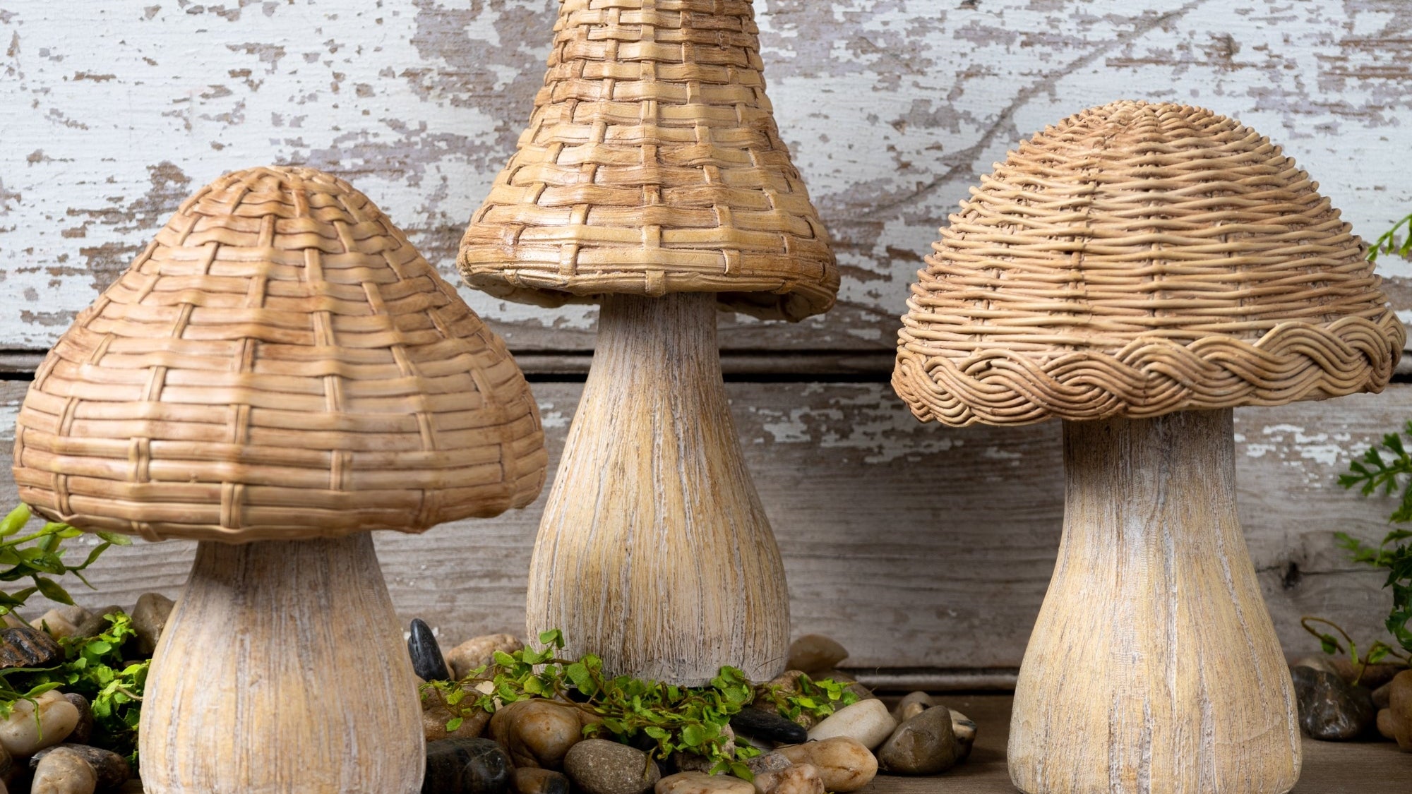 This decorative mushroom set adds whimsical, nature inspired charm to indoor living spaces. Crafted from durable resin, each mushroom features etched wood grain stems and wicker style tops finished in earthy brown tones. Designed as assorted sizes, this set creates visual interest when styled together on shelves, tables, or accent displays. The traditional design works well in rustic, woodland, or fairy garden themed interiors. Sold as a coordinated set of three for a balanced decorative arrangement. The mushrooms measure 5 L x 5 W x 6 H inches, 5 L x 5 W x 6.75 H inches, and 3.5 L x 3.5 W x 8.25 H inches. Intended for indoor decorative use only.