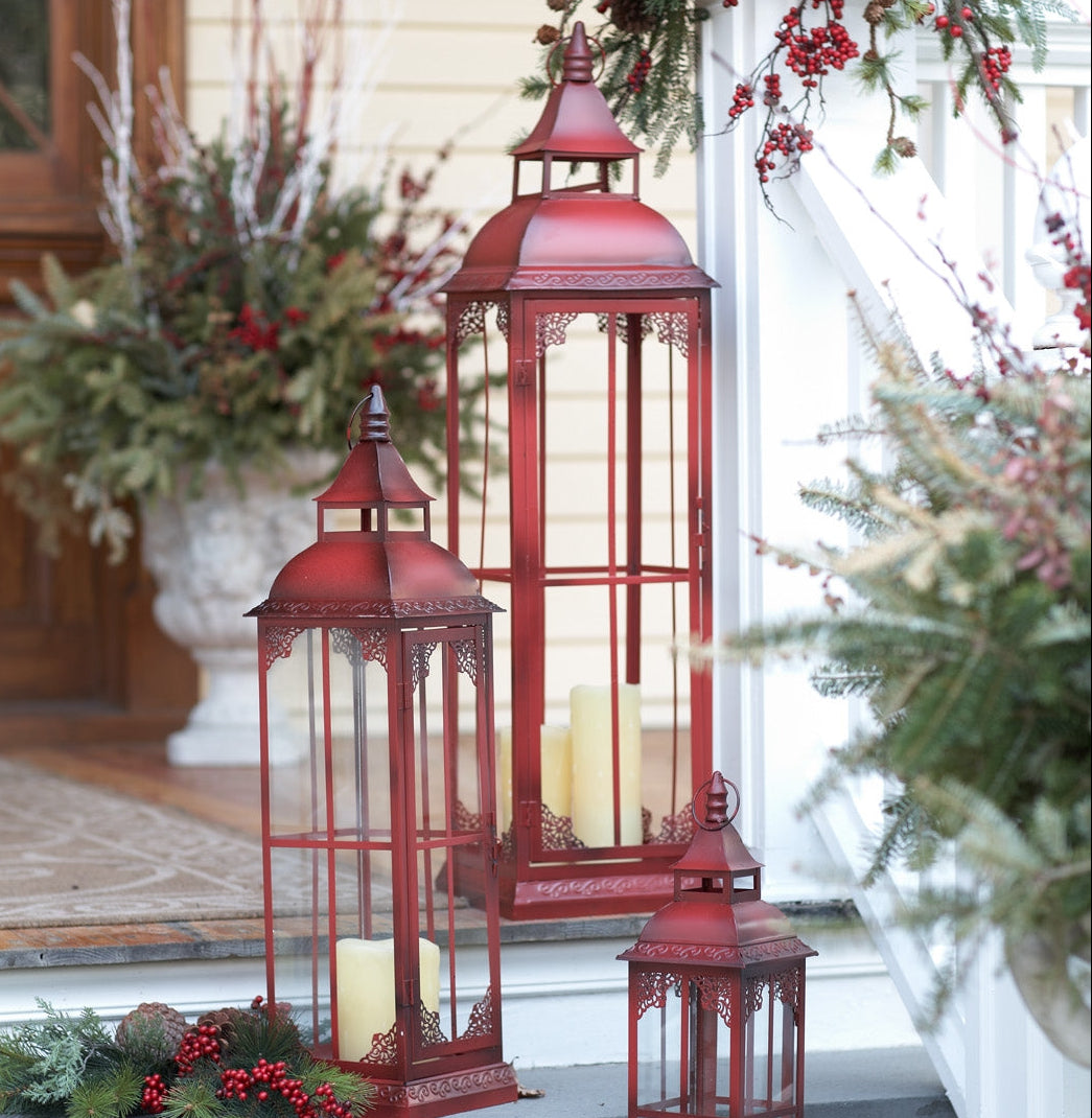 Add timeless style to your home with this set of 3 red metal floor lanterns, crafted from durable metal and glass for lasting beauty. Each lantern features a bold red finish and classic frame design, perfect for indoor or covered outdoor spaces. Ideal for real wax or LED candles, they bring warm ambiance to entryways, patios, living rooms, or seasonal displays. This set includes three sizes for a balanced arrangement: 9.5" L x 9.5" W x 37" H, 7.5" L x 7.5" W x 28" H, and 5.5" L x 5.5" W x 20" H. Versatile and decorative, these lanterns can also be used with florals or fillers to create custom looks. Designed for indoor use only.
