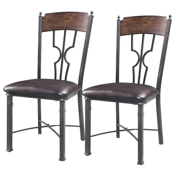 Bring home a voguish and comfortable seating option all in one. This set of two side chairs bears a metal framework. These side chairs Incorporate a faux leather upholstered padded seat for the utmost comfort and an open backrest with curved wood top. The fusion of its metal and polyresin construction offers a smooth finish alongside tensile strength. Other items features in the image are sold separately.