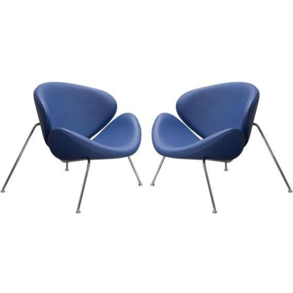 Chairs makes a great asset for any space. This set of two modern accent chairs features great designing with gentle curves. These chairs have a blue faux leather upholstered with curved backrest and seat that provides you the most desired comfort. The chairs are supported by chrome finish angled legs, each with round bottom which provides a great stability to its construction. Add a decent table to this set and make a cozy seating space within your home.