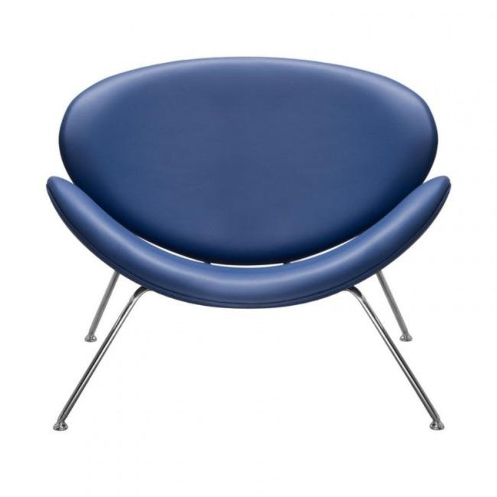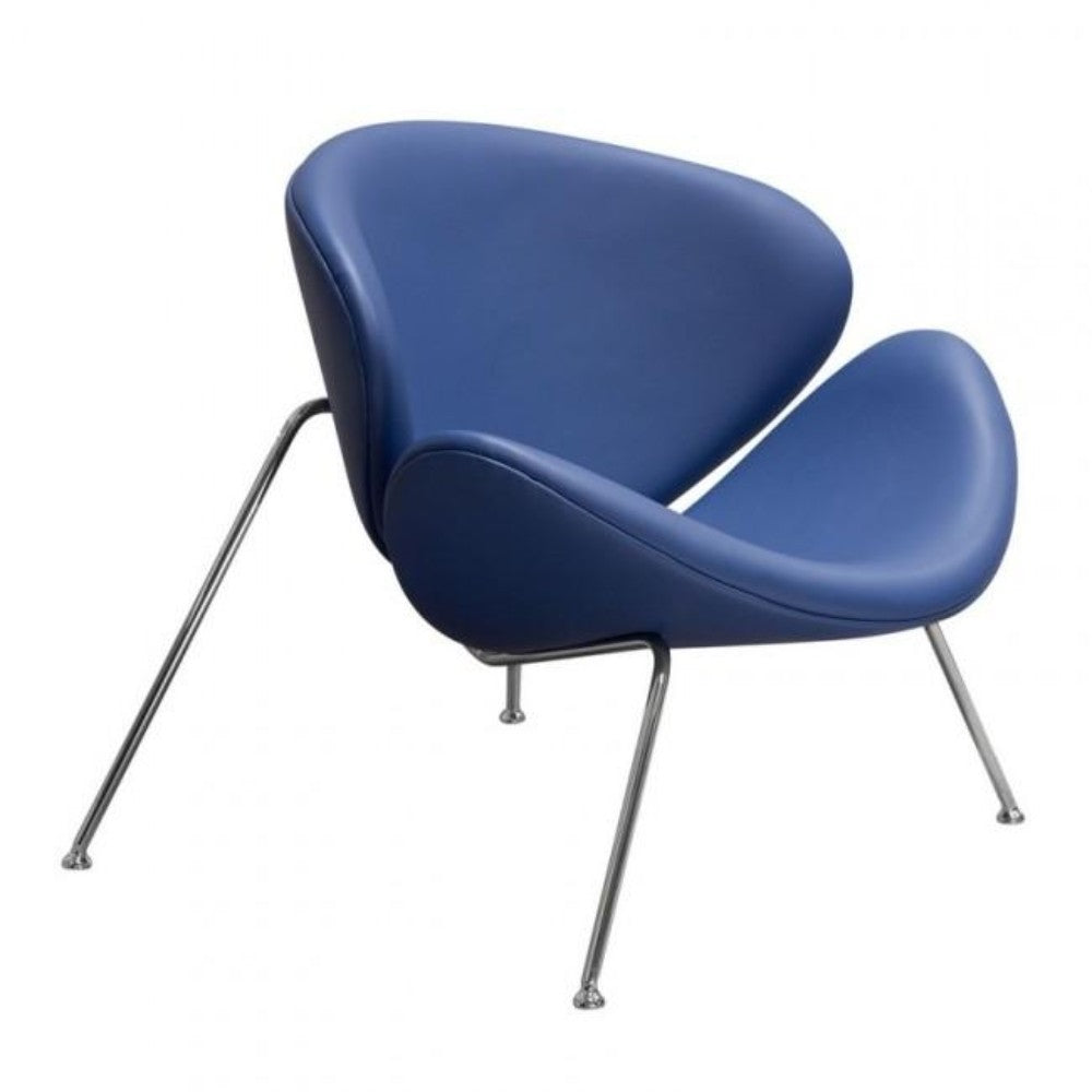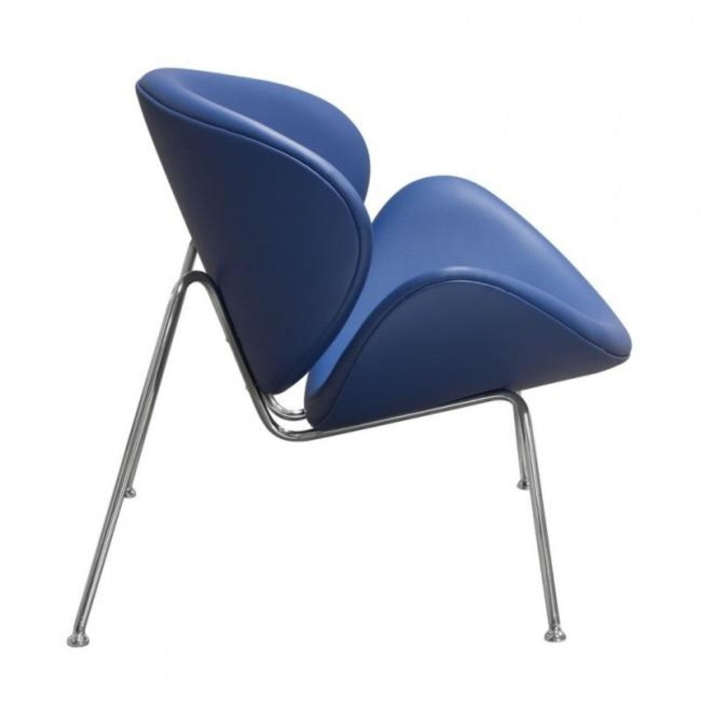 - Supported on chrome finish angled metal legs with blue faux leather upholstery.