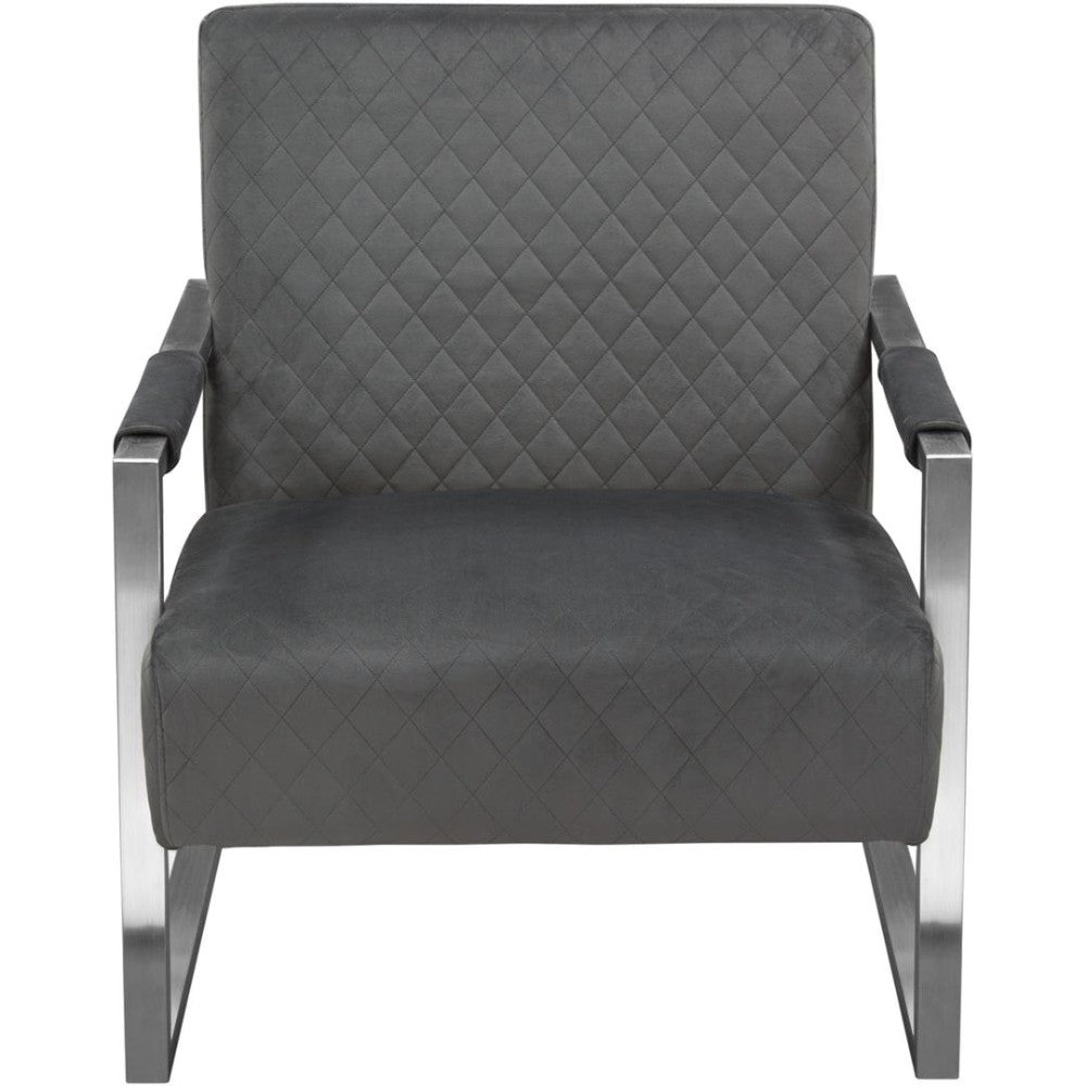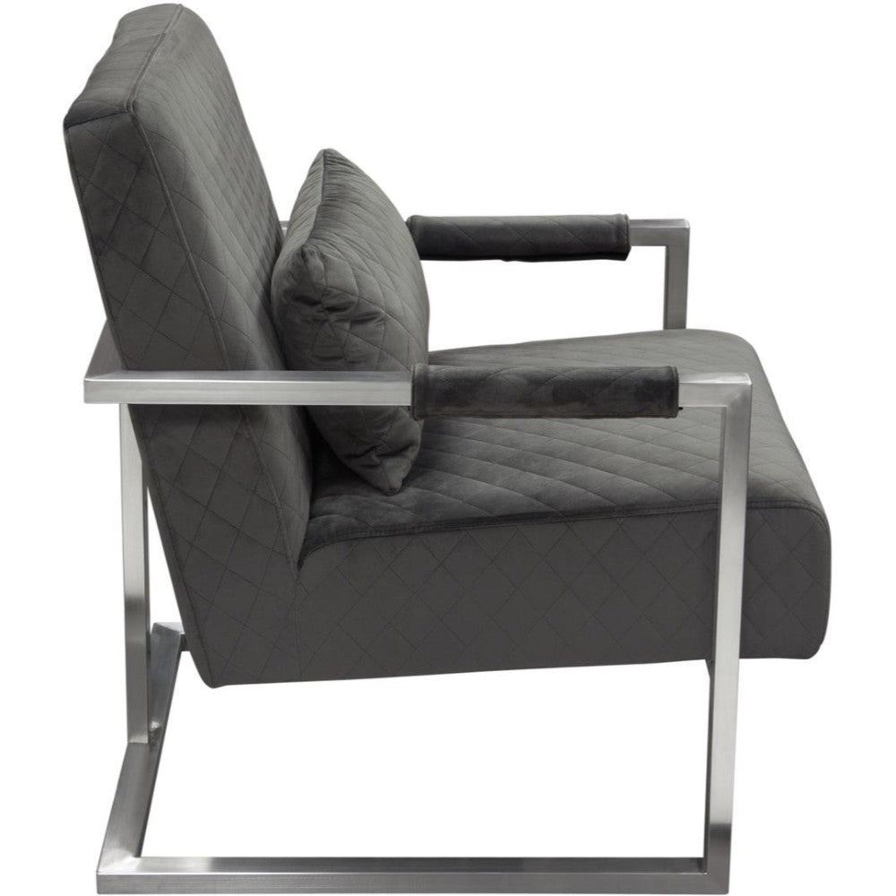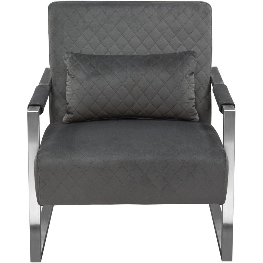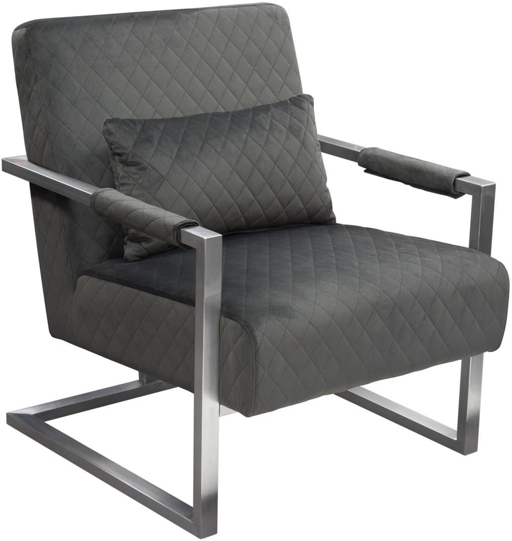 • Stylish stainless steel framed accent chair features dusk gray velvet upholstery.
