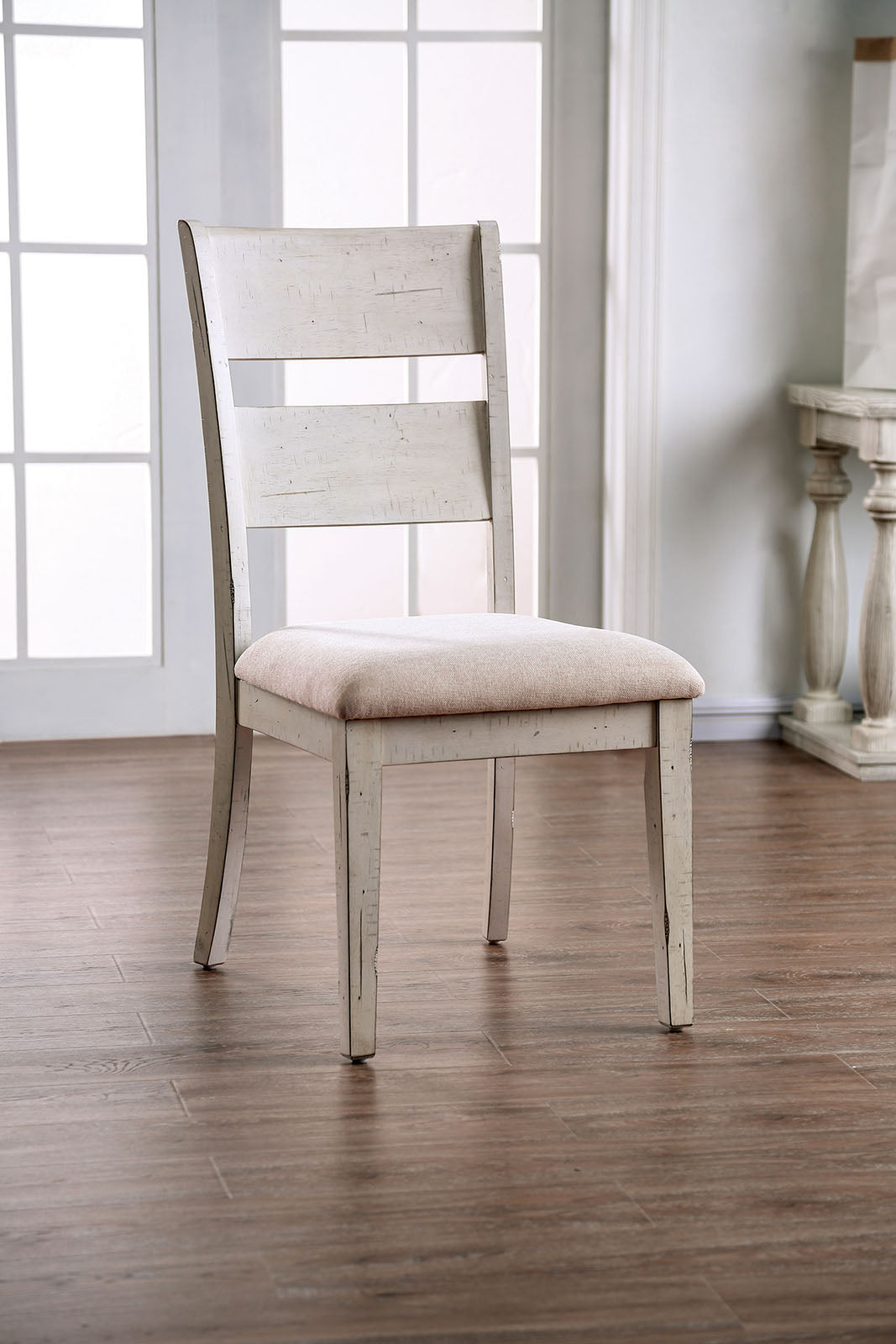 Enjoy a relaxing evening in your living space with this side chair which is made from solid wood. It incorporates tapered legs and padded seat. Upholstered in beige color fabric, this side chair bears a white color body. It is a perfect addition for your living room or to create a cozy corner in your bedroom or study. It comes in a pack of two.Dimension:19 1/2``W X 20 1/4``D X 40``H