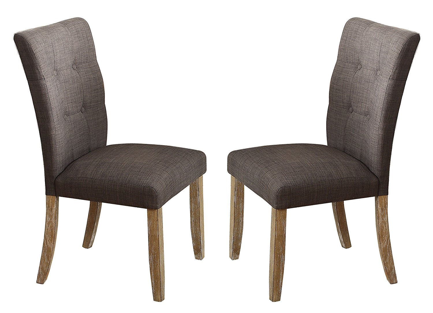 Guaranteed to impress, this set of 2 Dining Side Chairs make a statement whether It`s at the table, in the living room, or in your office. This set of two dining Side Chairs are enlivened by a tufted back, and the incredibly soft dark grey fabric upholstery. These Chairs are crafted from solid hardwood frame and finished in weathered wood for a timeworn appeal. These Chairs will look wonderful in your formal dining room and can complement almost any style of decor - from traditional to modern. Dimensions: Width:19in x Depth:25in x Height:38in