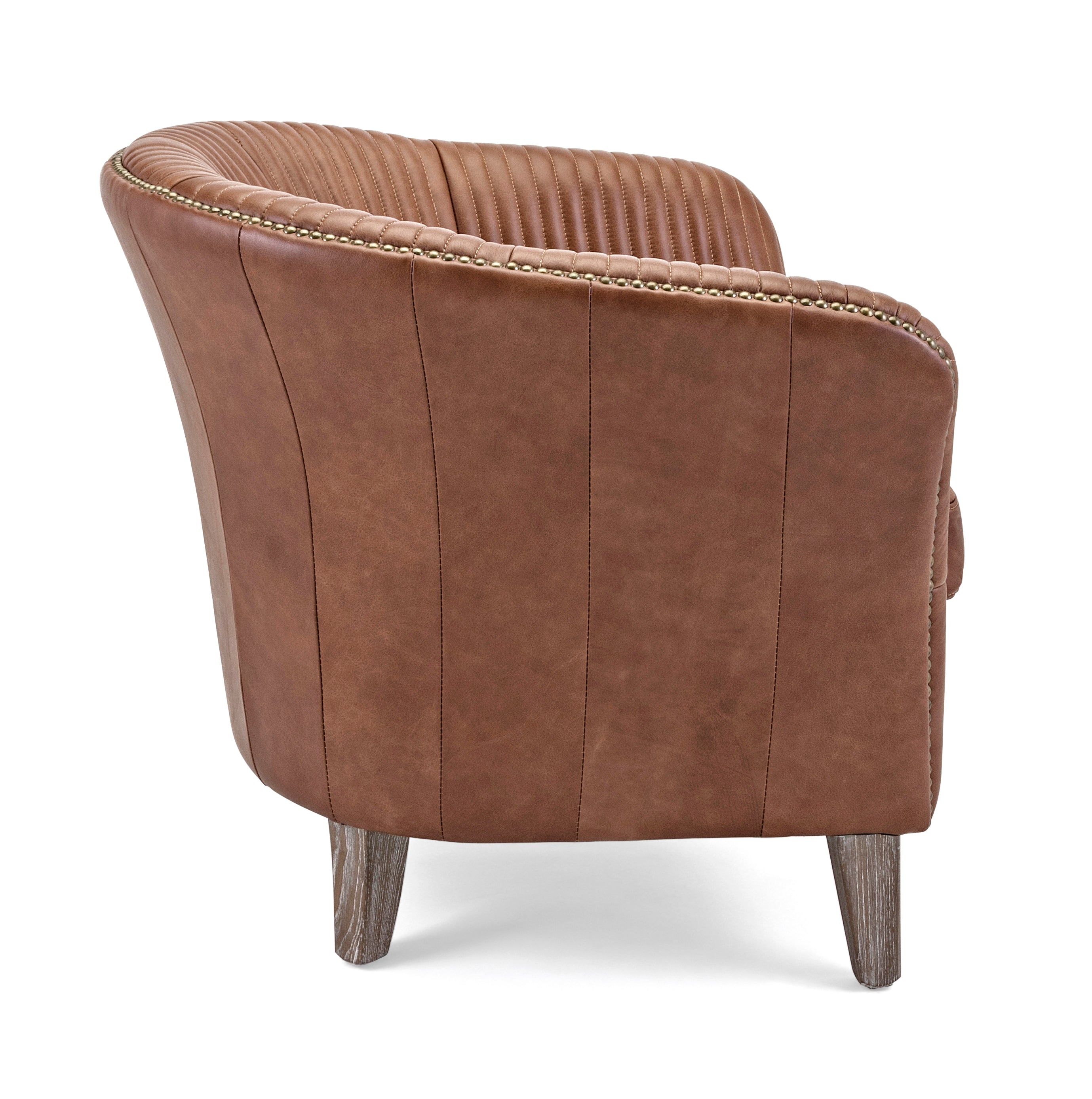 - Genuine leather armchair in rich tan with wooden legs and metal stud details