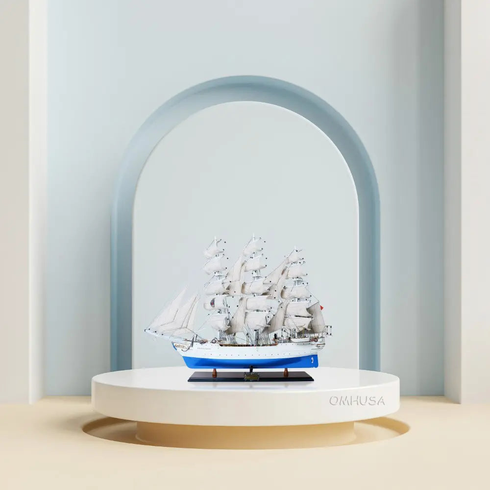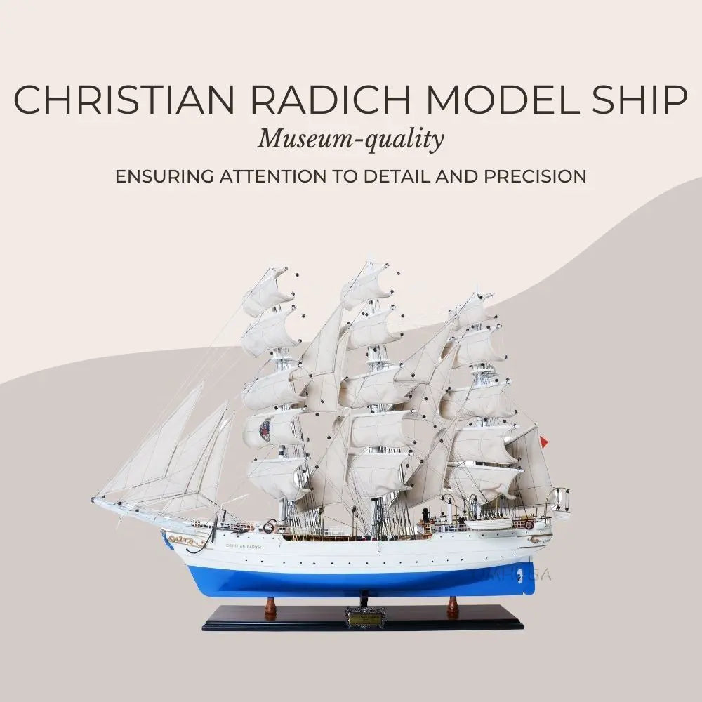 This Christian Radich Admiral Line model is a fully assembled, museum quality replica of the Norwegian full rigged training ship. Standing 30 inches tall, it is hand built from western red cedar, rosewood, and mahogany with metal fittings. The model features a two tone hull, three decks, bowsprit, three masts with hand stitched unfurled sails, metal anchors, and a wooden rudder. On deck, detailed elements include cranes, lifeboats, barrels, light beacons, windlass, and cabin. The model rests on a solid wood base with brass nameplate. Perfect for collectors and maritime enthusiasts, it showcases exquisite craftsmanship and historical authenticity for display in home or office.