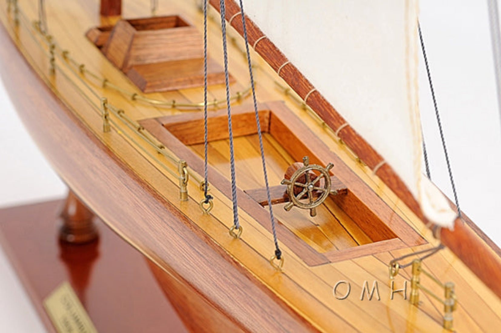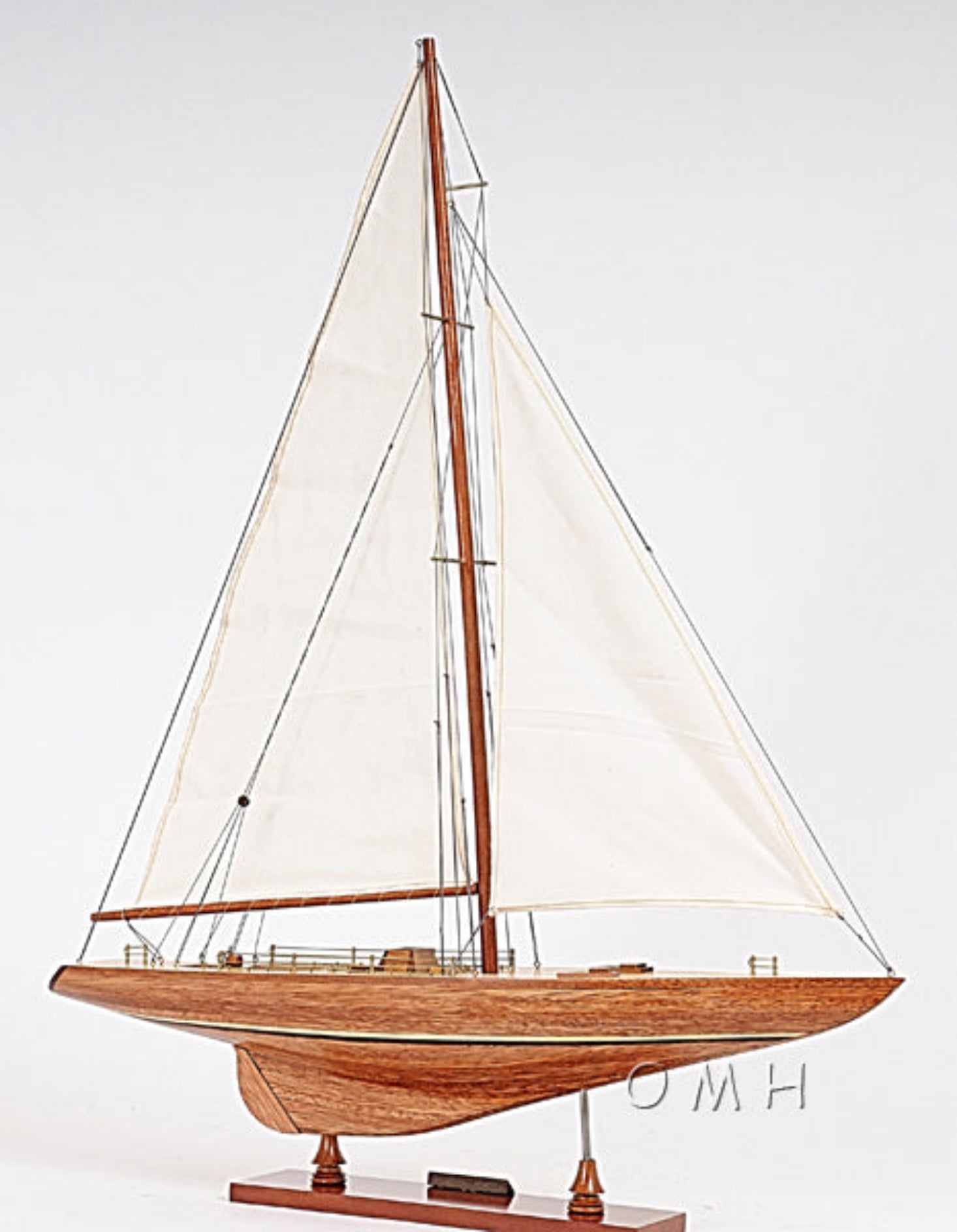 Experience maritime elegance with this handcrafted Columbia Yacht L model, a stunning replica of the 1958 America’s Cup defender. Built using the plank-on-frame method from premium woods such as western red cedar, rosewood, mahogany, and teak, this model captures the grace and craftsmanship of the original yacht. It features a single mast with hand-stitched linen sails, intricate rigging, metal stanchions and railings, and a smooth varnished hull with a painted waterline. Designed to exact scale from historical plans, this Columbia 1958 model rests on a solid wood base with a brass nameplate. The mast folds down for easy shipping. Perfect for collectors, sailing enthusiasts, and nautical decor lovers.