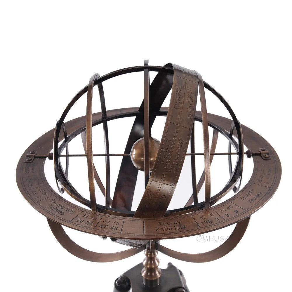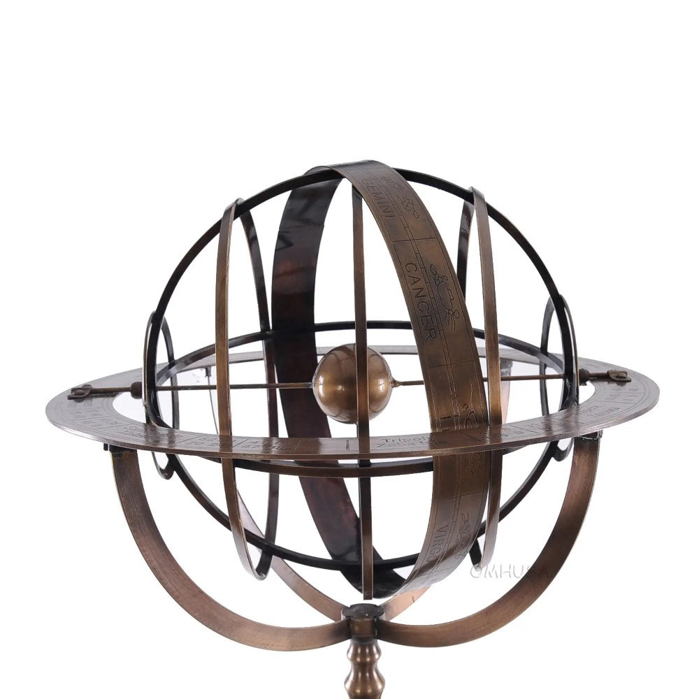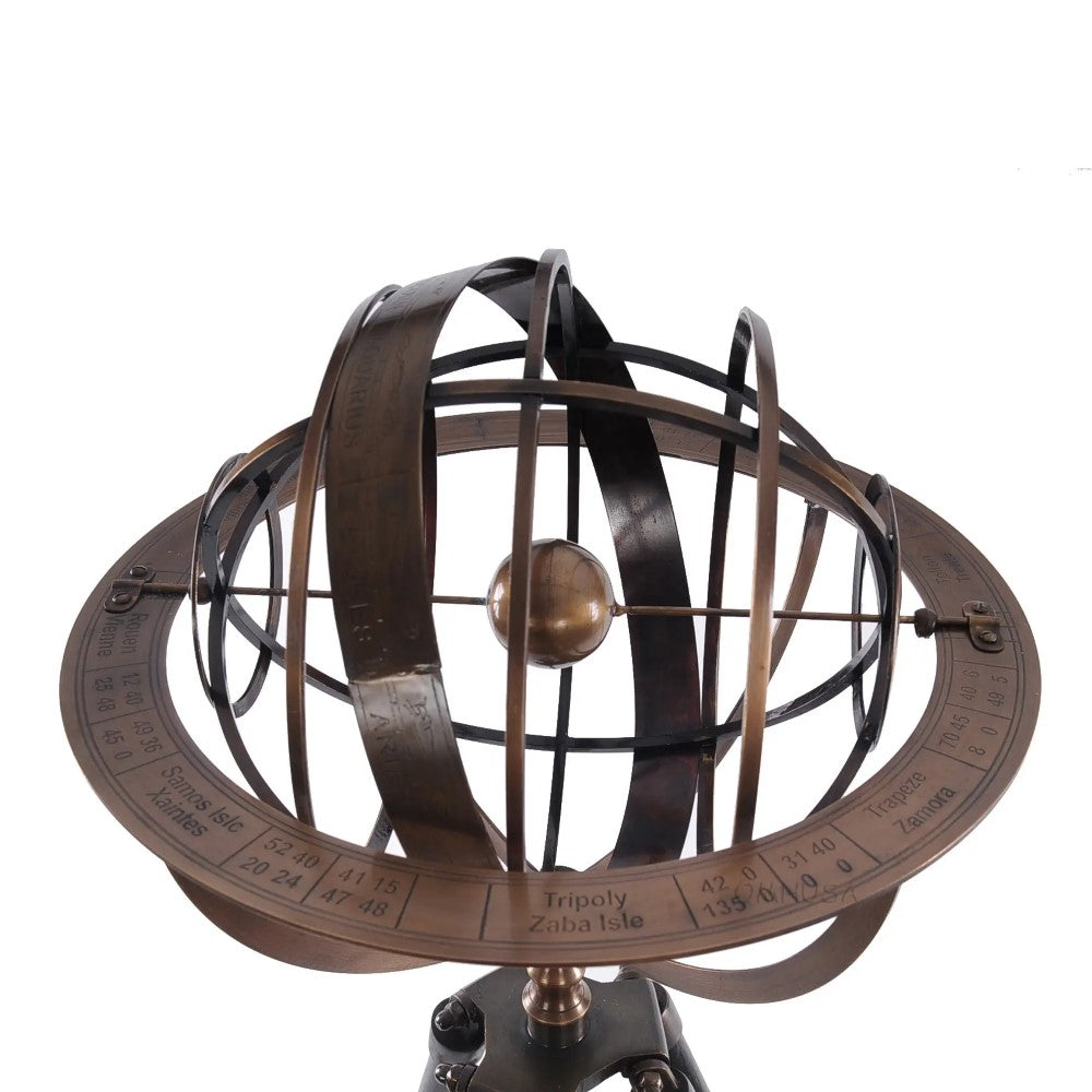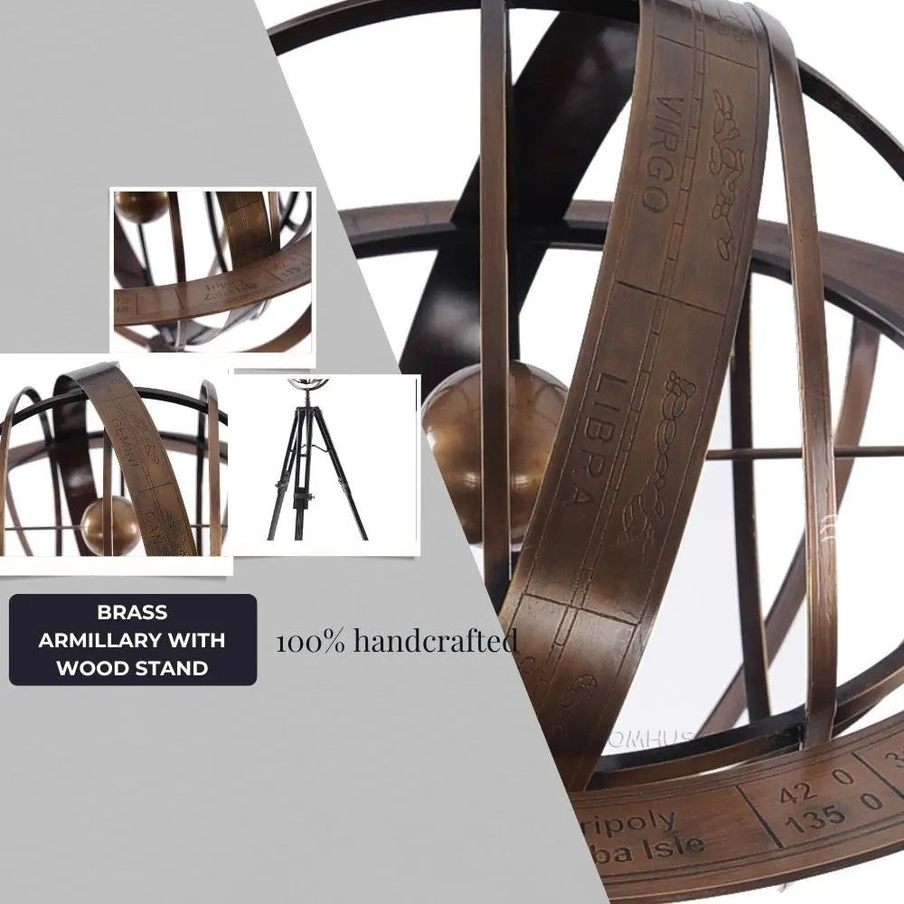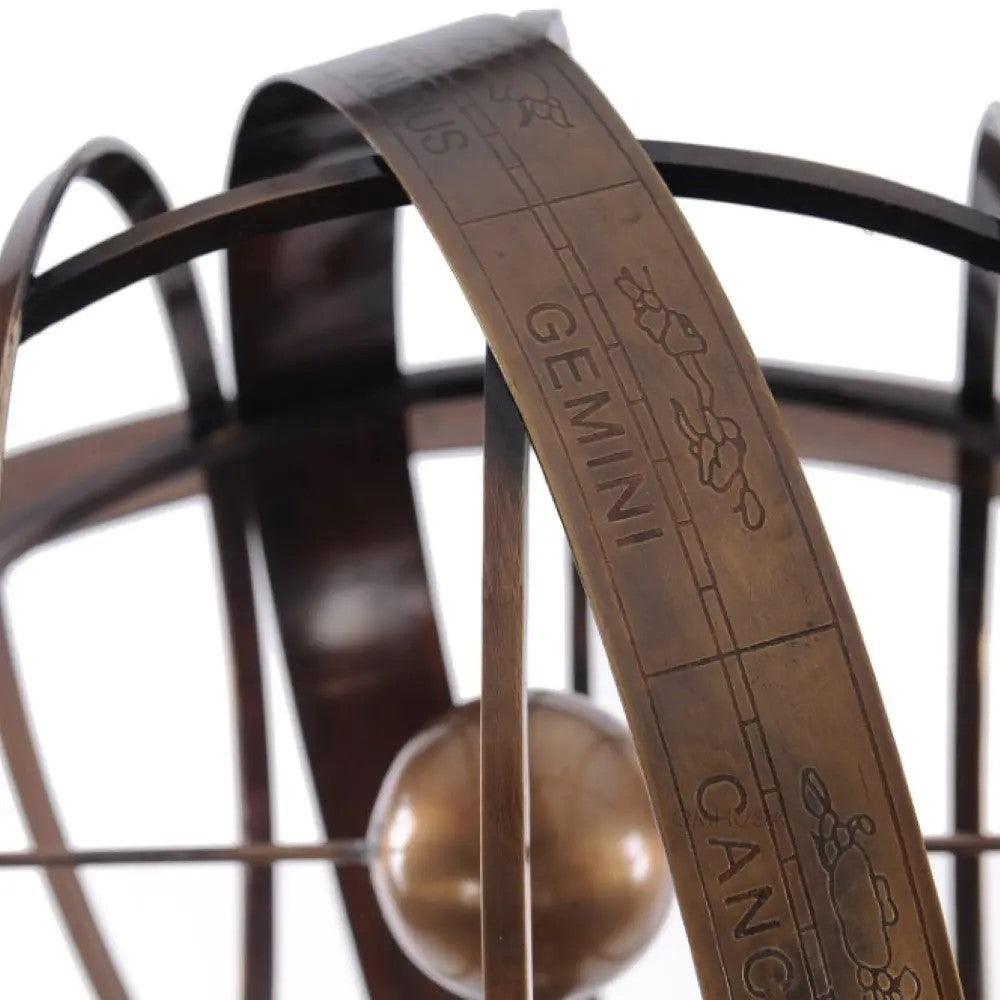 Decorative Brass Armillary – Coffee Wood Base – Etched Zodiac Design By Old Modern Handicrafts