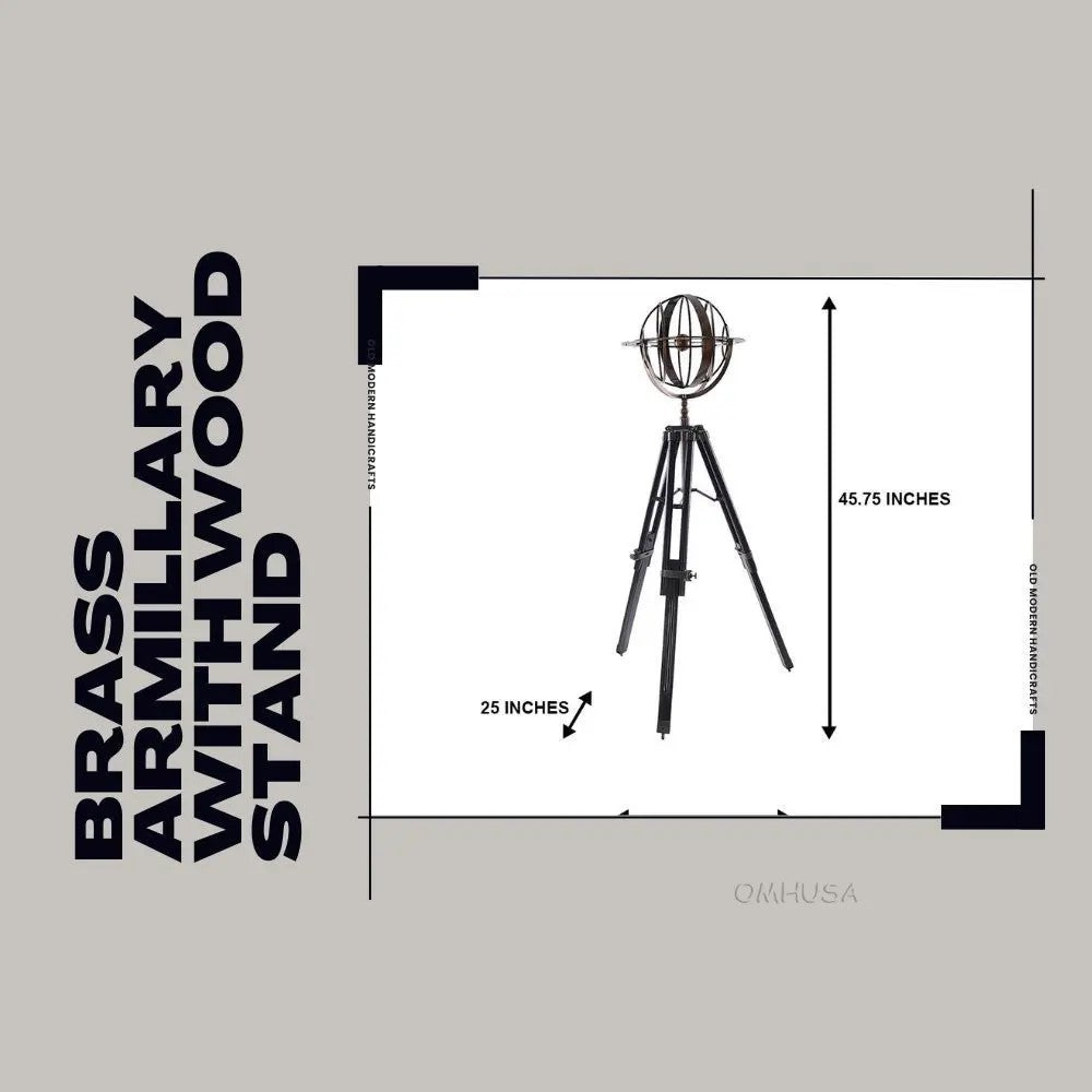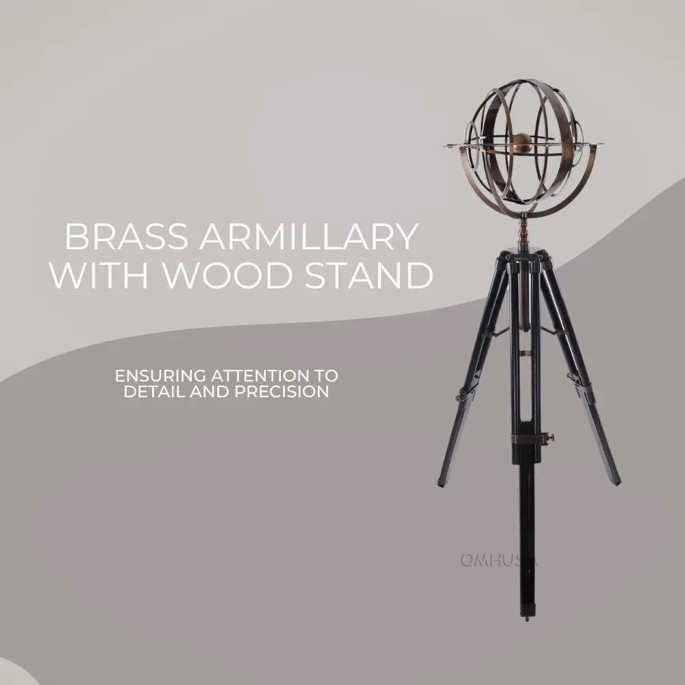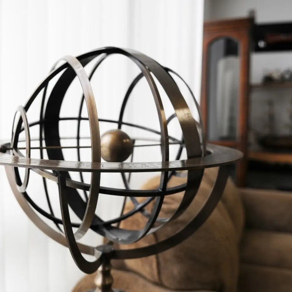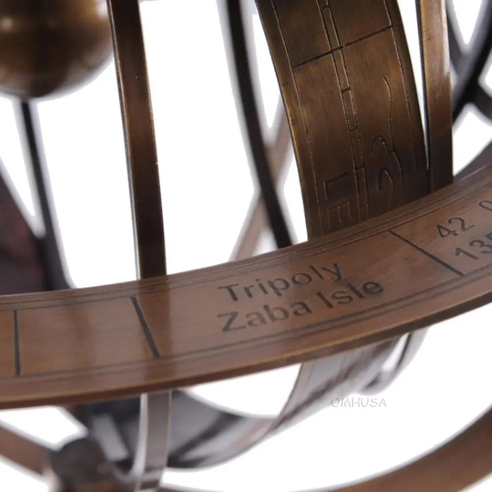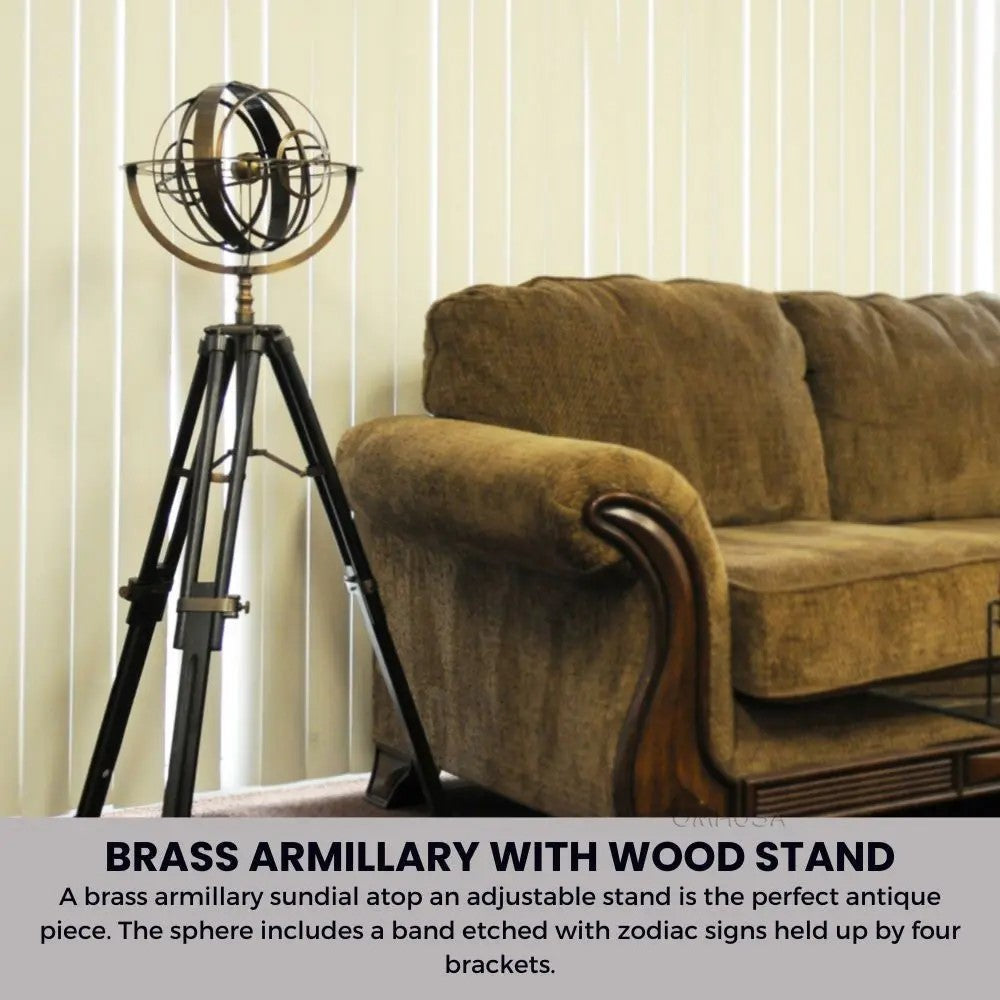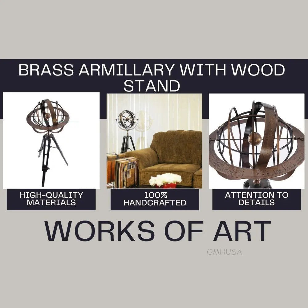 Decorative Brass Armillary – Coffee Wood Base – Etched Zodiac Design By Old Modern Handicrafts