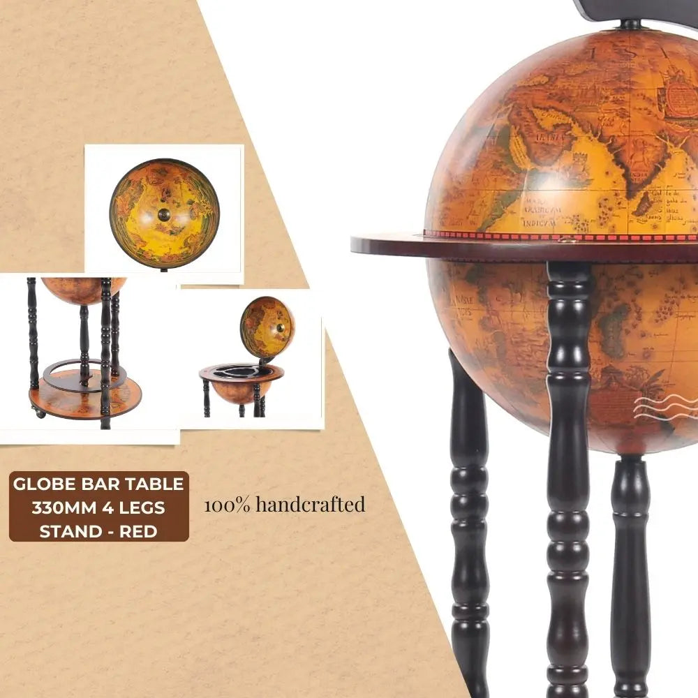 Globe Bar Table – 35H Red Wooden Cabinet – Nautical Map Design By Old Modern Handicrafts