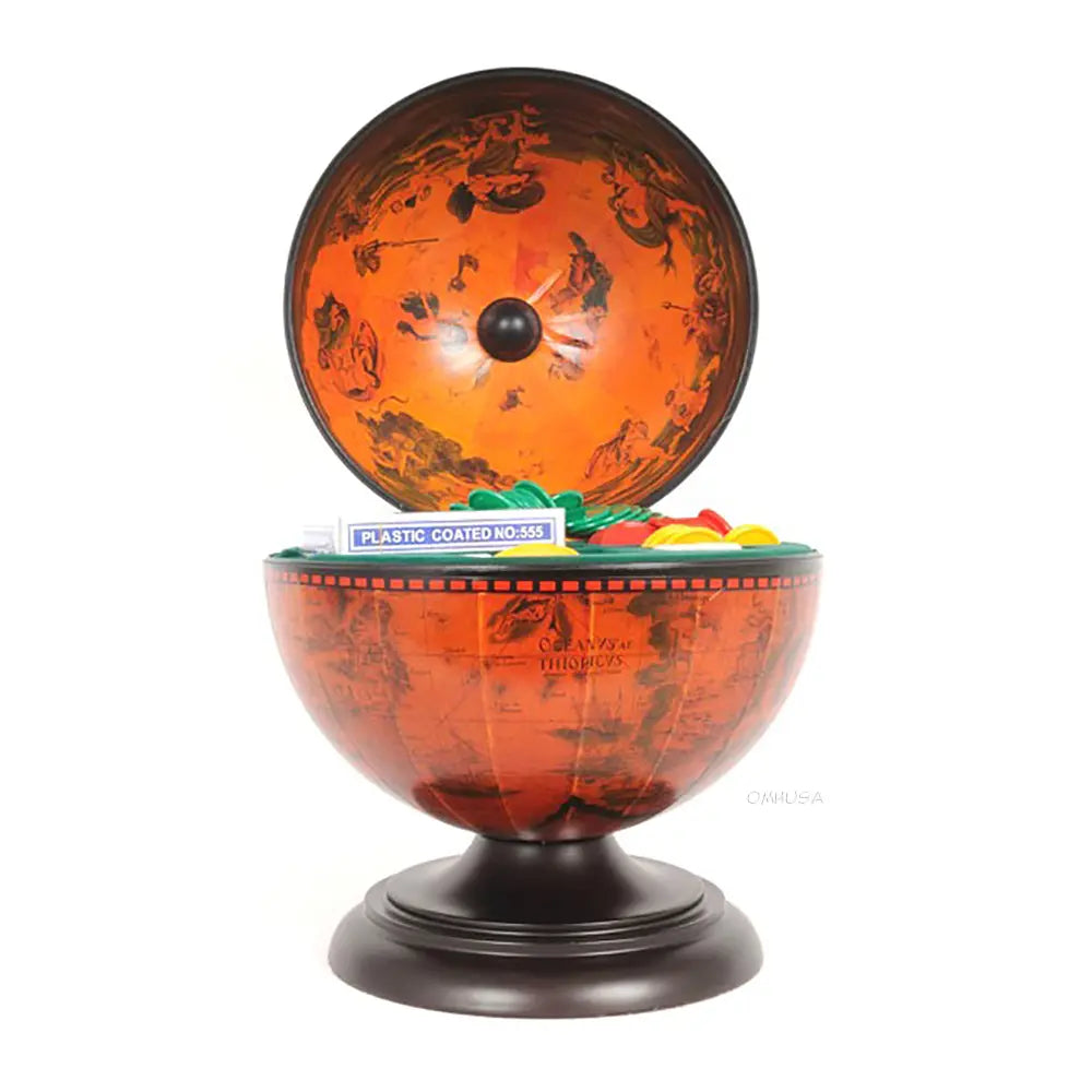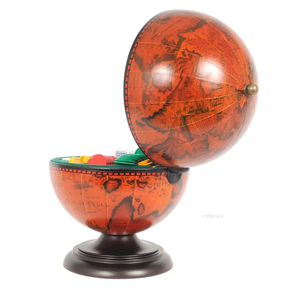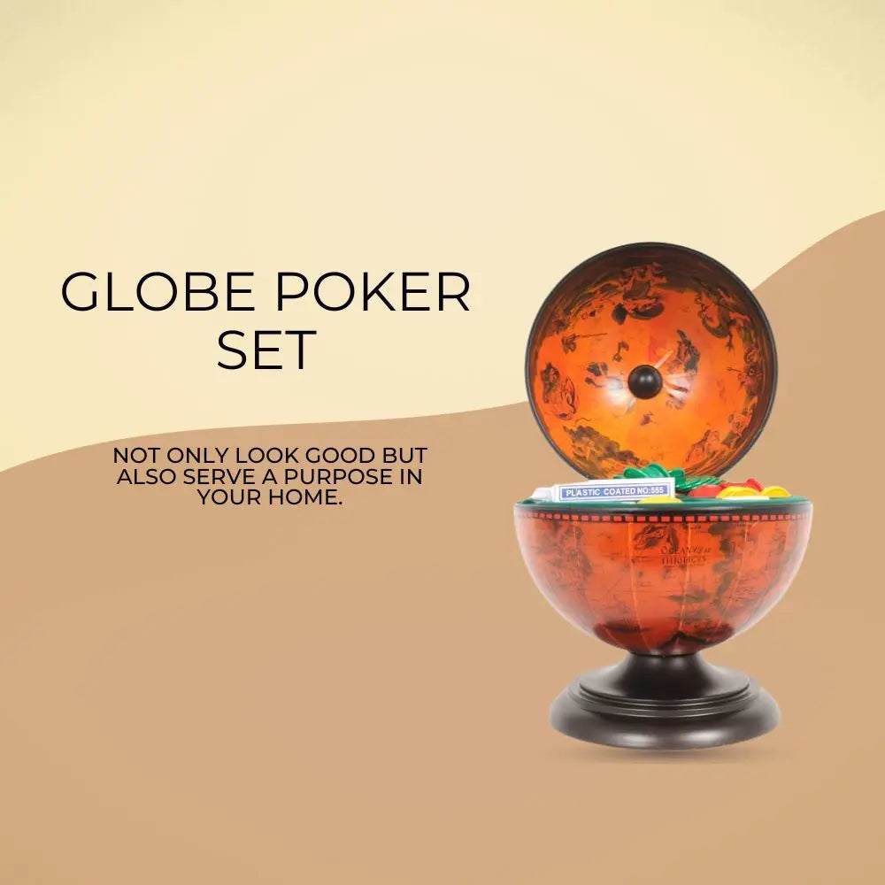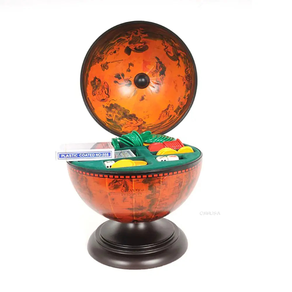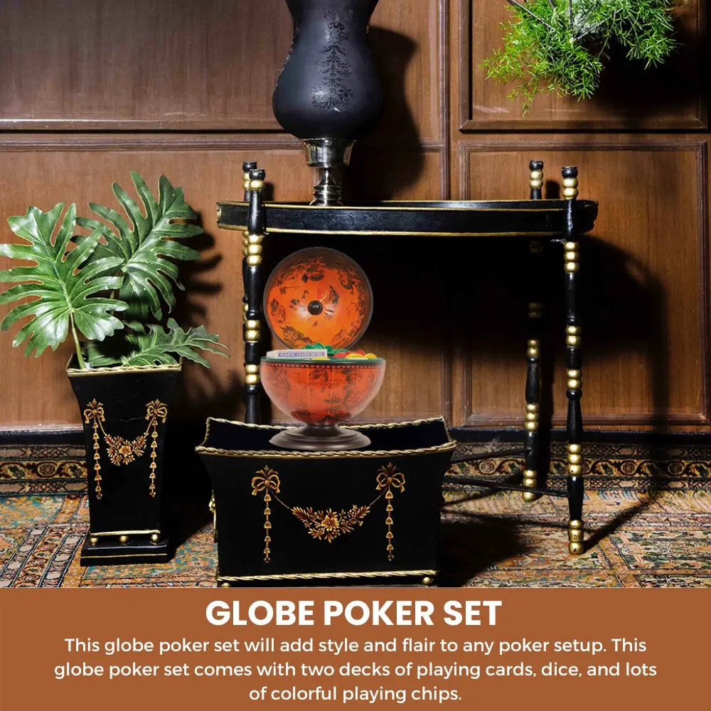 The Globe Poker Set – 11H Wooden Game Case – Decorative Felt Interior combines entertainment with timeless craftsmanship. Handcrafted from solid wood, this globe-shaped poker set features a soft felt interior and elegant vintage design. Inside, you’ll find two decks of cards, dice, and colorful poker chips neatly organized for easy access. The unique globe form opens to reveal a complete poker collection, making it both functional and decorative. Ideal for game nights, living room display, or gifting, this set adds sophistication and charm to any home or office. Perfect for enthusiasts who appreciate both classic style and quality construction.