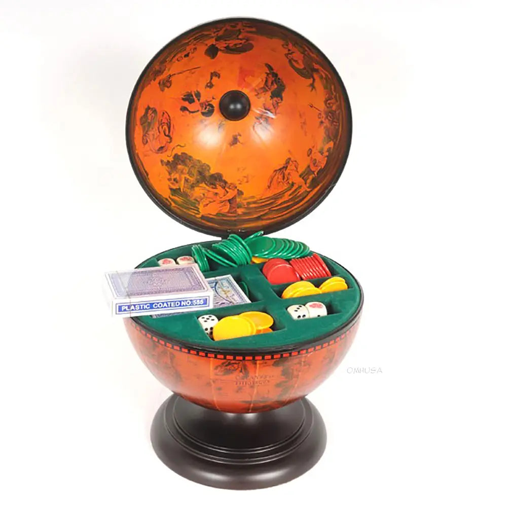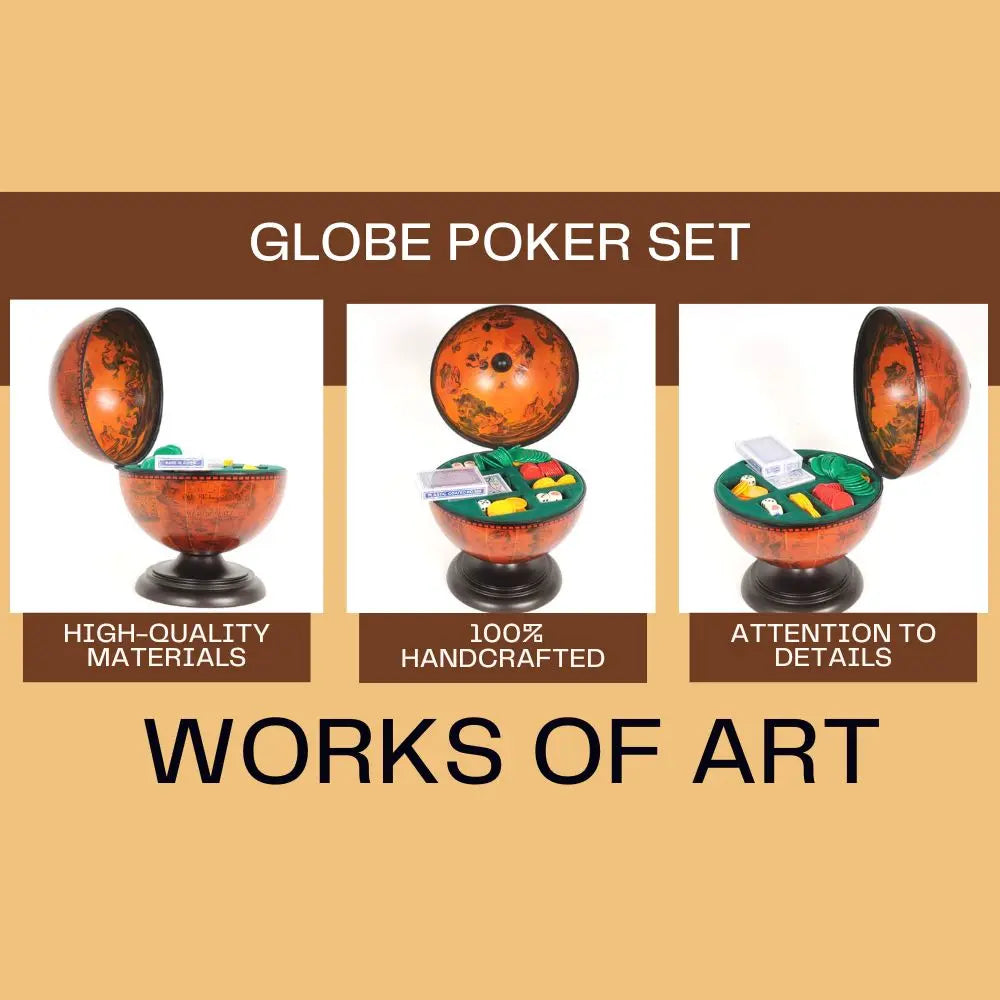 Globe Poker Set – 11H Wooden Game Case – Decorative Felt Interior By Old Modern Handicrafts