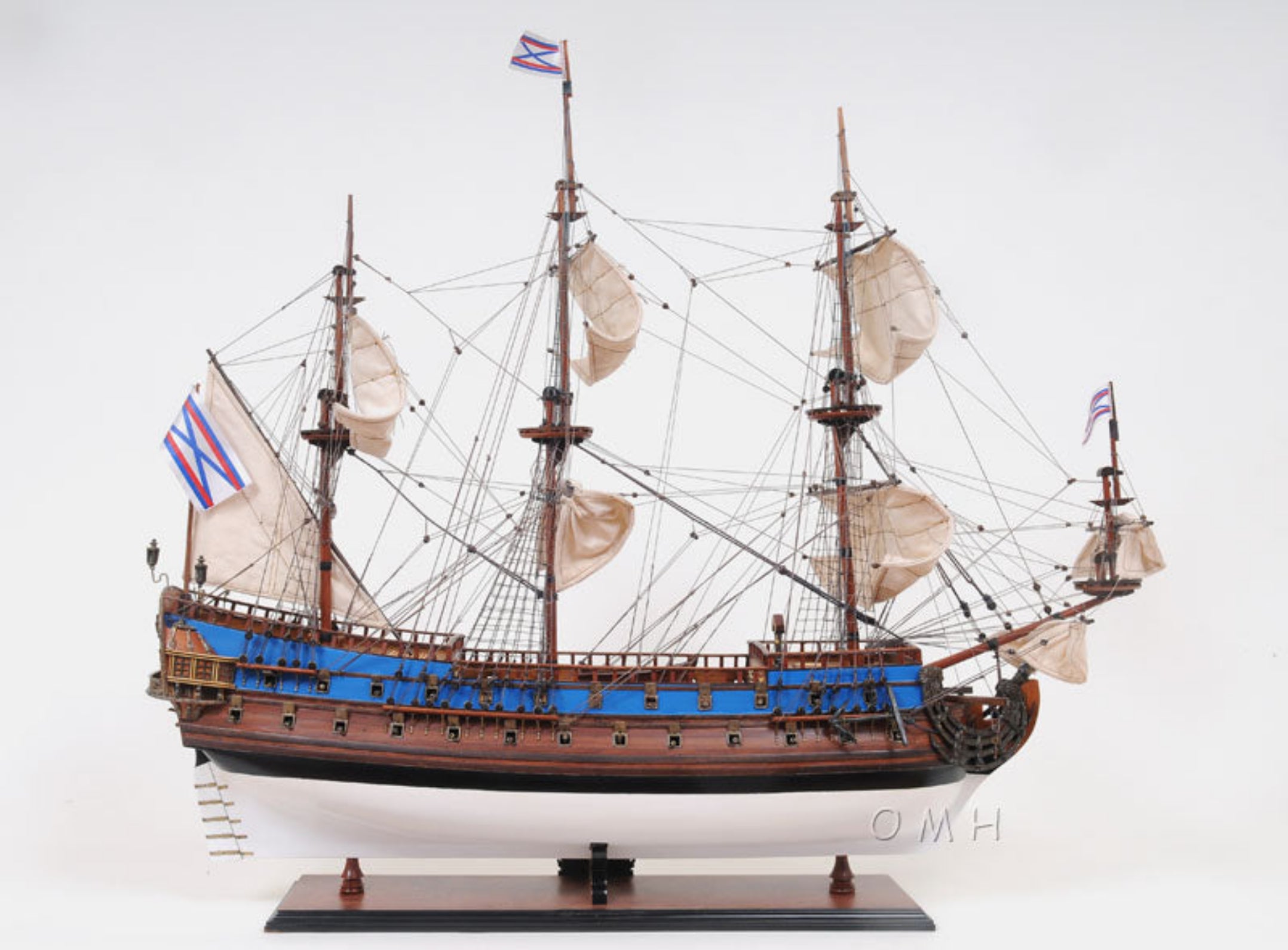 This fully assembled 33-inch Goto Predestination wooden ship model is a handcrafted replica of the 18th-century Russian naval flagship. Built by master artisans using high-grade woods like cedar, rosewood, and mahogany, each model is meticulously constructed with plank-on-frame methods, similar to actual shipbuilding. It features three decks, two cannon rows, and hand-knotted rigging with fine linen sails. Decorative details include lifeboats, anchors, lanterns, and intricate stern ornaments. Displayed on a solid wood base with brass nameplate, this ship makes a stunning centerpiece for collectors, nautical enthusiasts, or office decor.