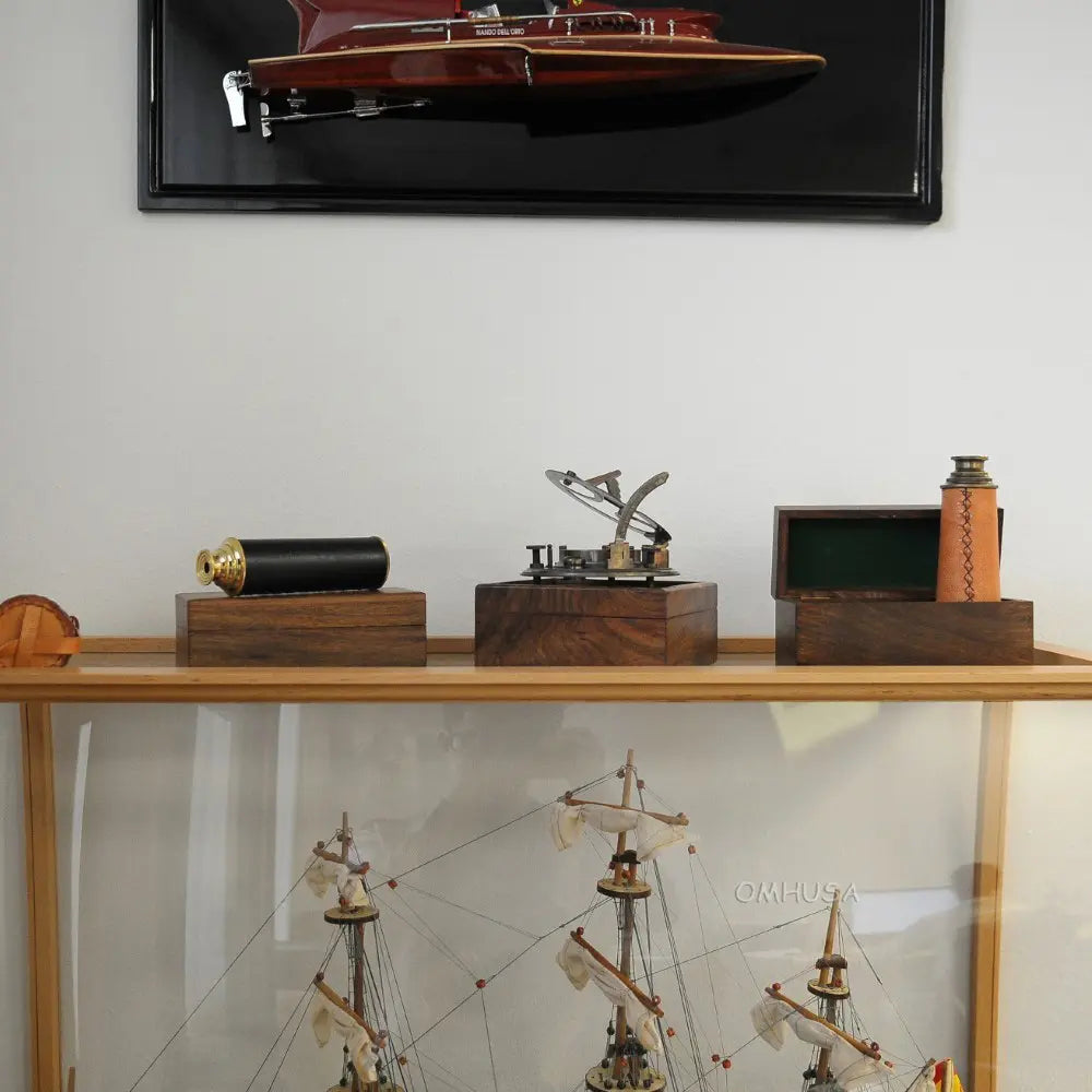 The Handheld Telescope – 1.5H Brass with Black Leather – Nautical Wood Box combines timeless craftsmanship with elegant design. Made from solid brass and wrapped in black leather, it delivers both durability and classic style. The telescope extends to 15 inches with approximately 8x magnifying power, making it ideal for display or light use. Each piece comes housed in a handcrafted rosewood box with a smooth polished finish for safe storage. Perfect for nautical enthusiasts, collectors, or as a refined gift, this telescope captures the spirit of maritime exploration and adds vintage charm to any desk, bookshelf, or display space.