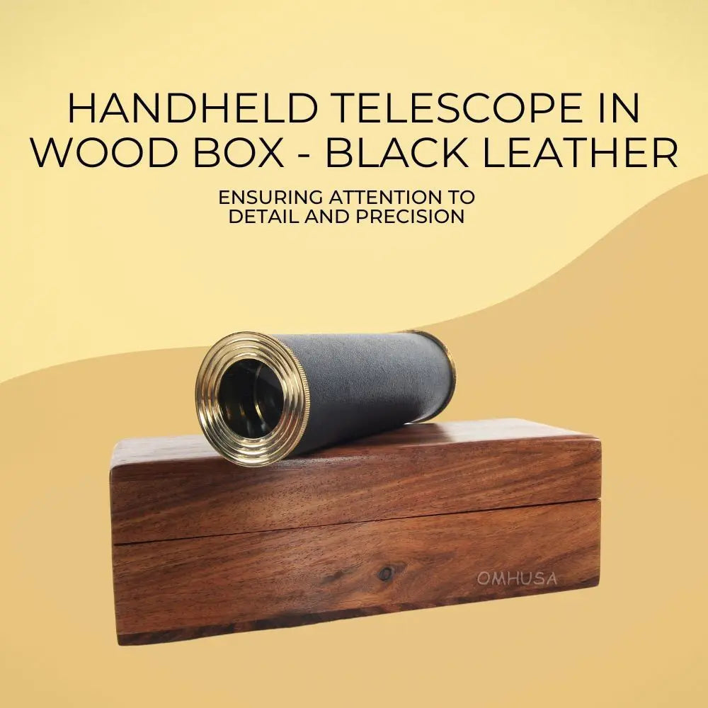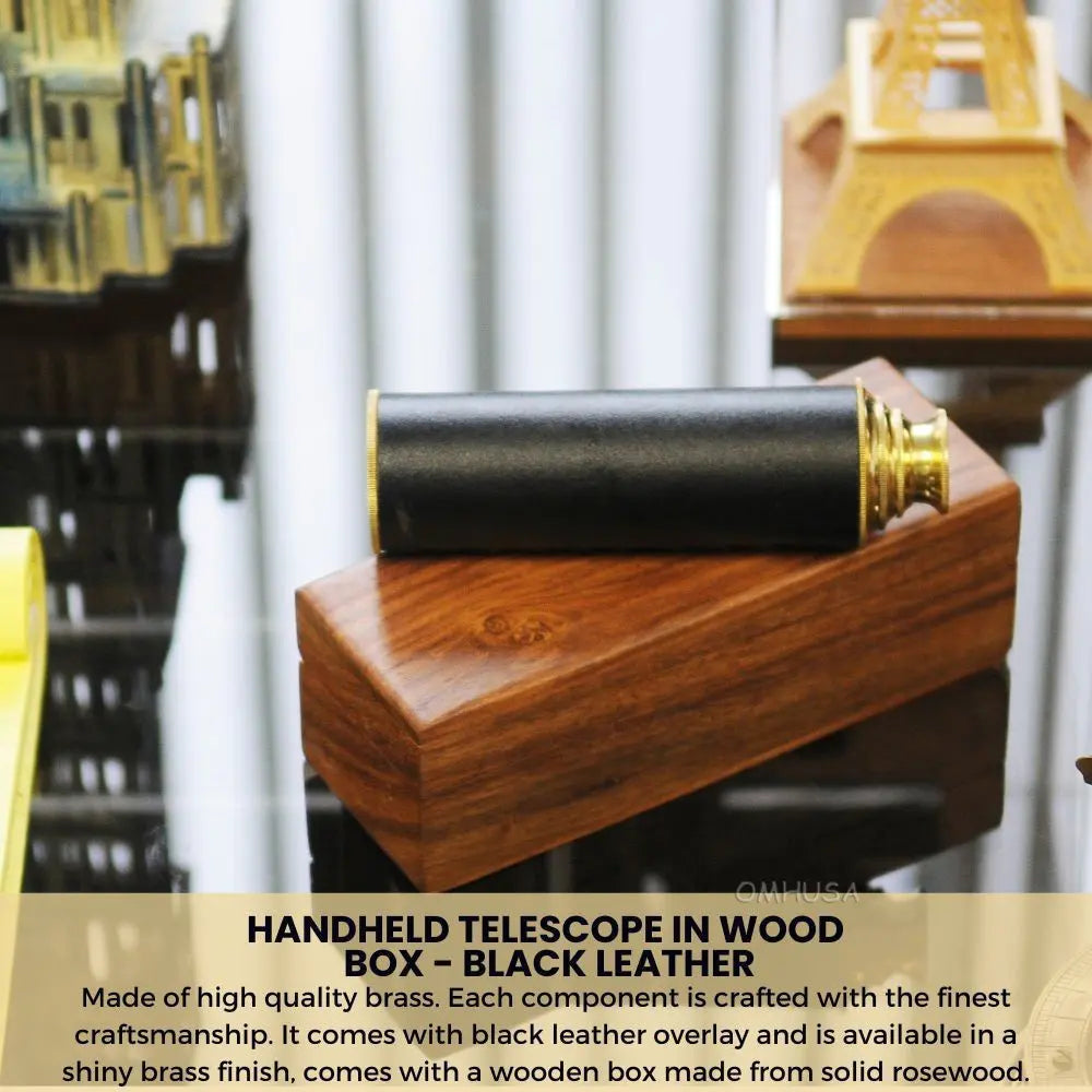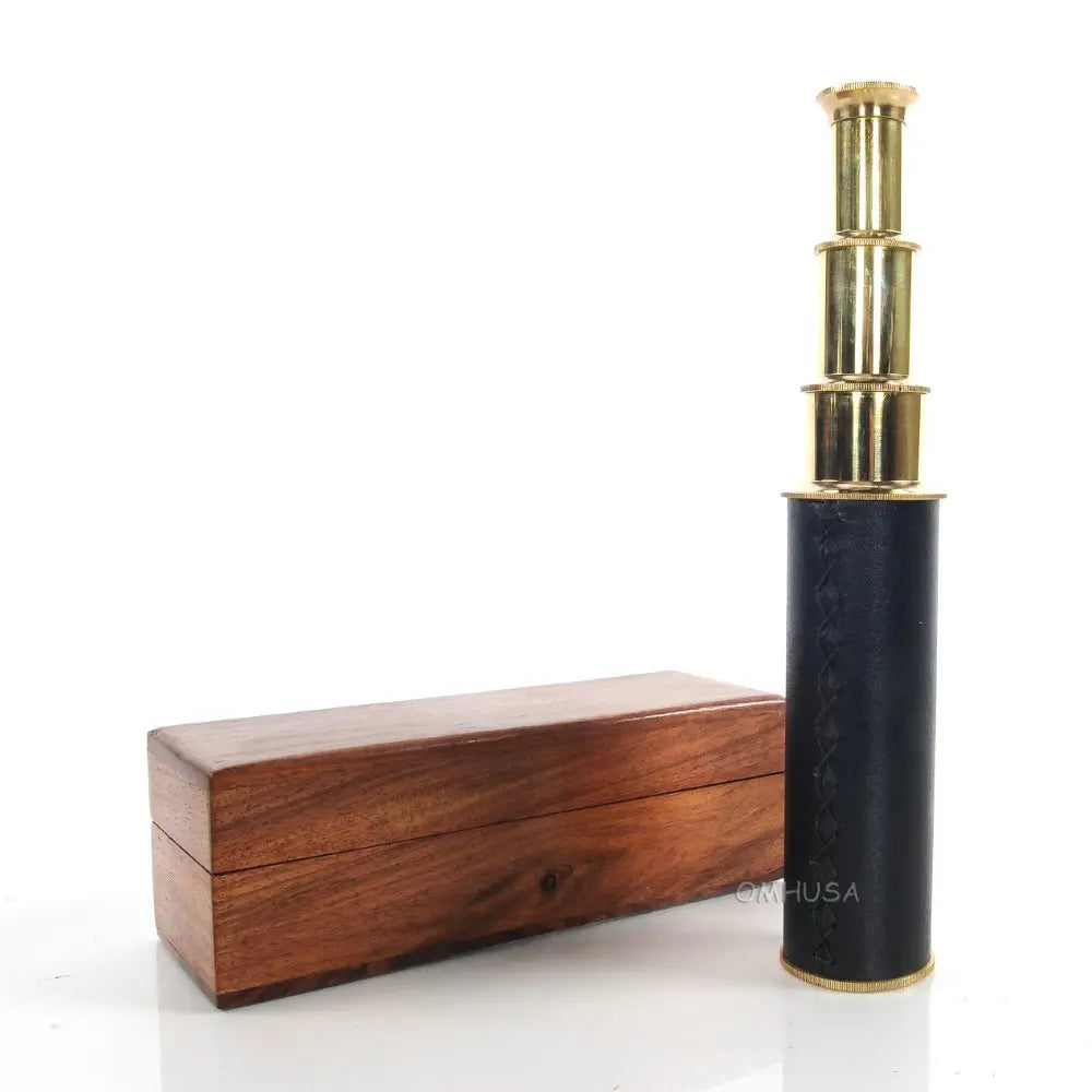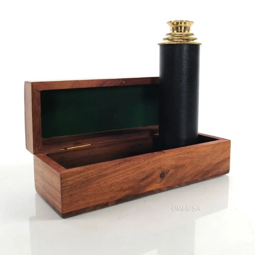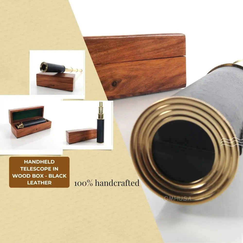 Handheld Telescope – 1.5H Brass with Black Leather – Nautical Wood Box By Old Modern Handicrafts