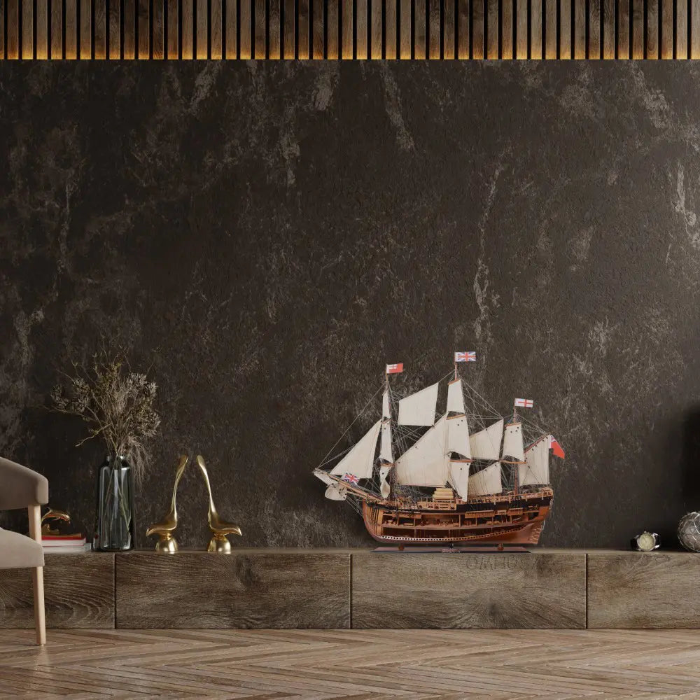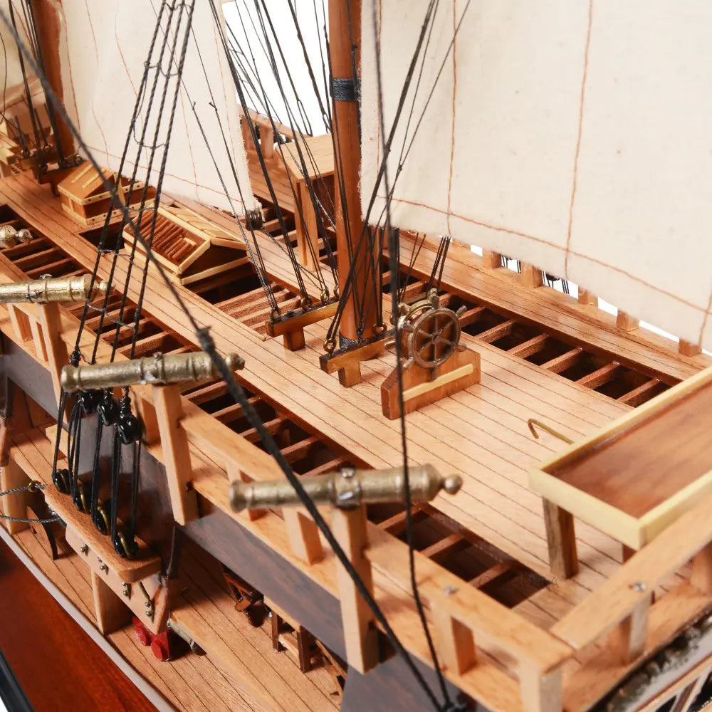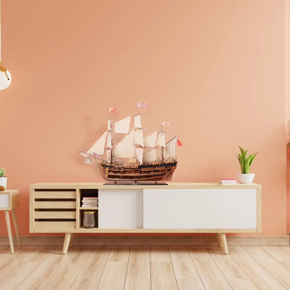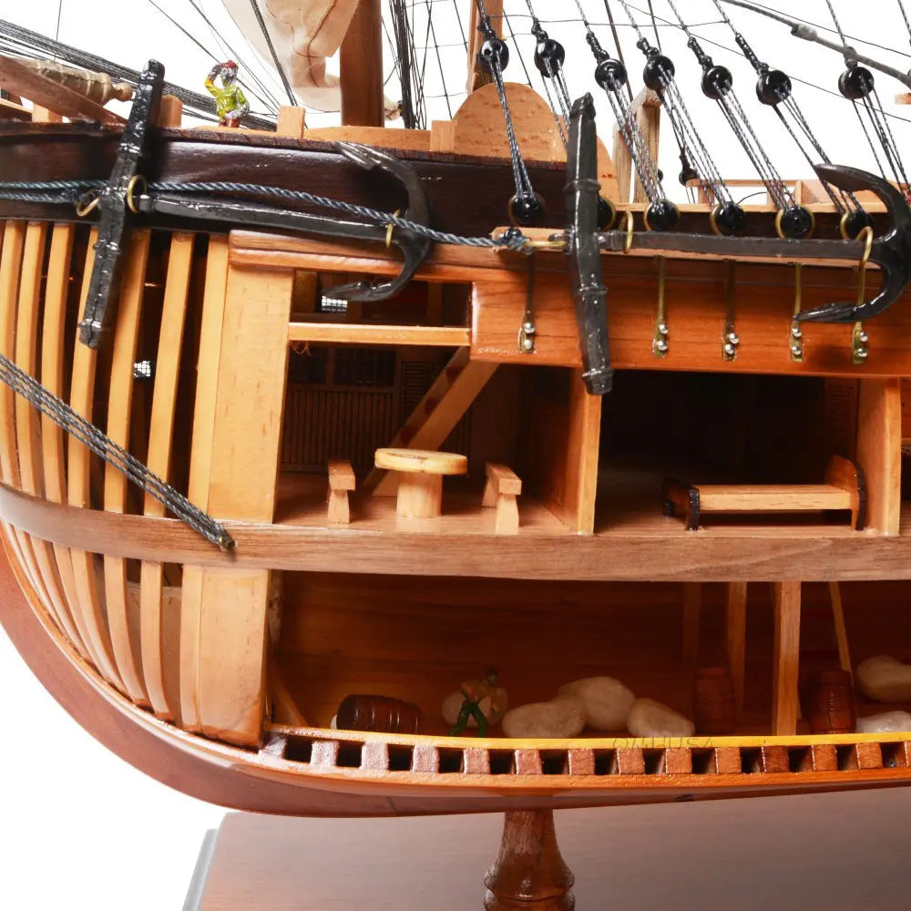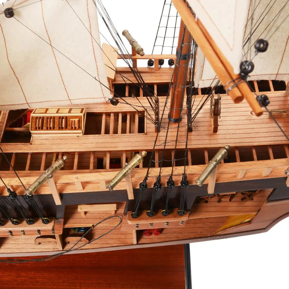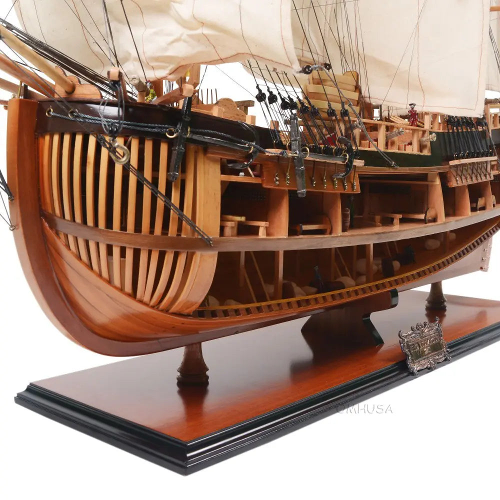 This 33-inch HMS Endeavour Open Hull model ship is a handcrafted replica inspired by the vessel commanded by Lieutenant James Cook. Built by expert artisans, it features premium woods such as rosewood, cedar, and mahogany with fine brass details and metal sculptures. Each model requires over 200 hours of meticulous assembly using traditional plank-on-frame construction. The open hull reveals intricate interior details like furniture, staircases, and crew figures. It includes lifeboats, cannons, and a British Royal Navy flag mounted on a solid wood base with brass nameplate. Fully assembled and ready for display, this model is ideal for collectors and nautical décor enthusiasts.