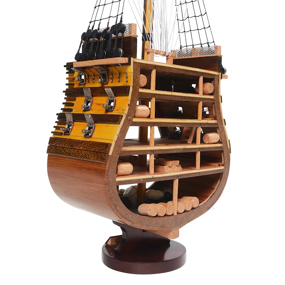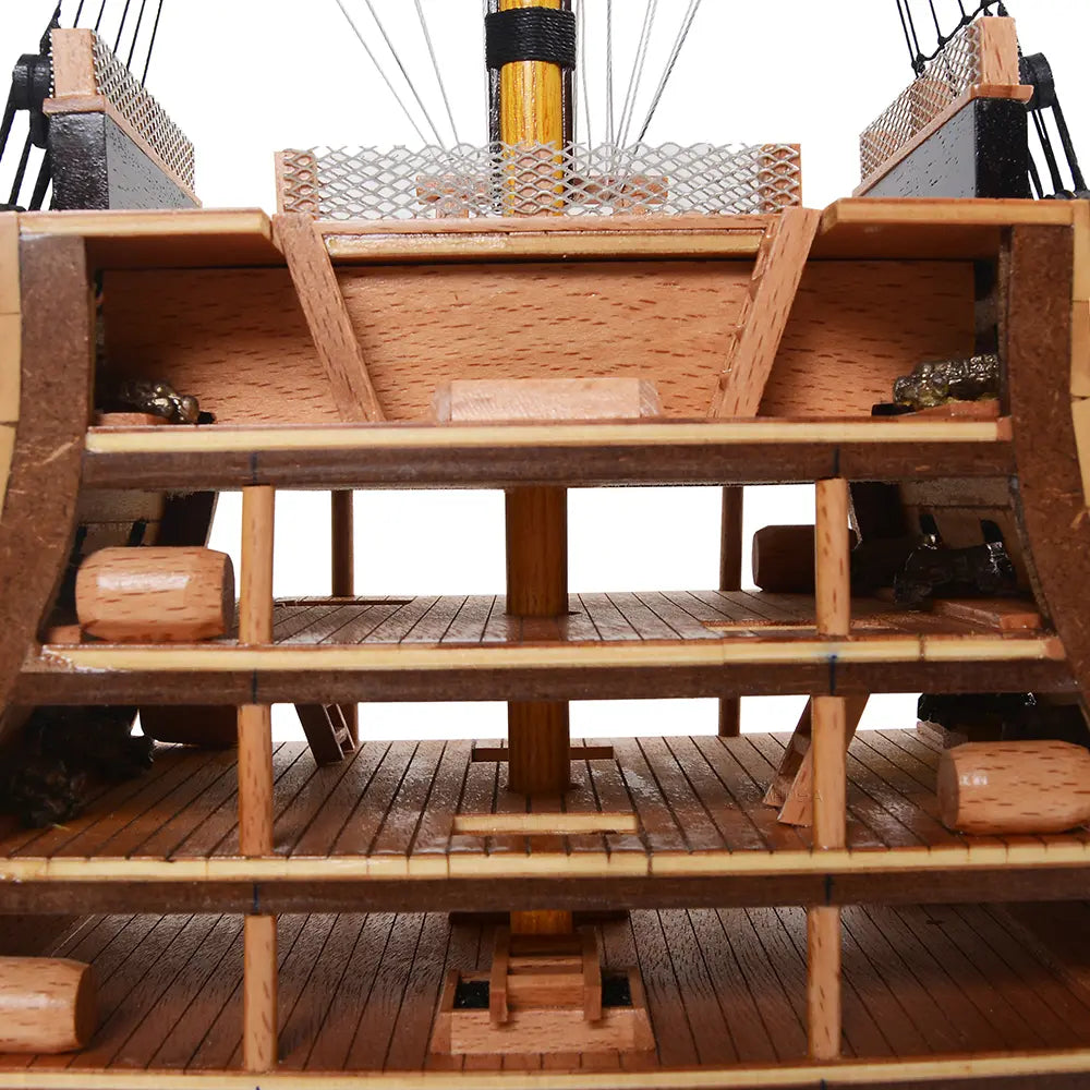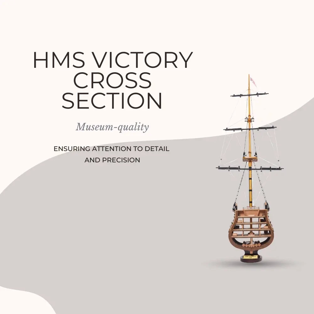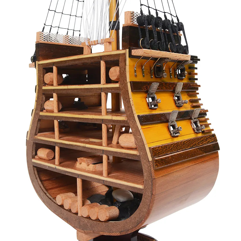 The HMS Victory Cross Section model captures the interior structure and deck arrangement of Britain’s most celebrated warship. Fully assembled and handcrafted from high-quality wood, this 35.25-inch tall model is built using traditional plank-on-frame construction. Skilled artisans dedicate over 50 hours to create each piece, featuring metal cannons, rigging, ladders, skylights, and a painted hull. Resting on a solid wooden base with a metal nameplate, it provides an authentic look into 18th-century shipbuilding craftsmanship. Ideal for collectors and maritime enthusiasts, this model combines historical significance with detailed artistry for a timeless display.
