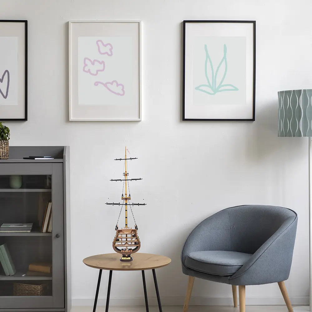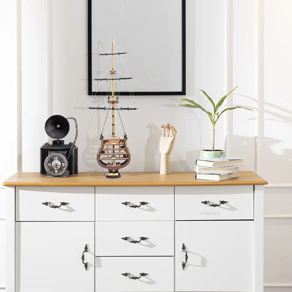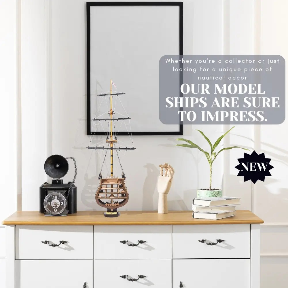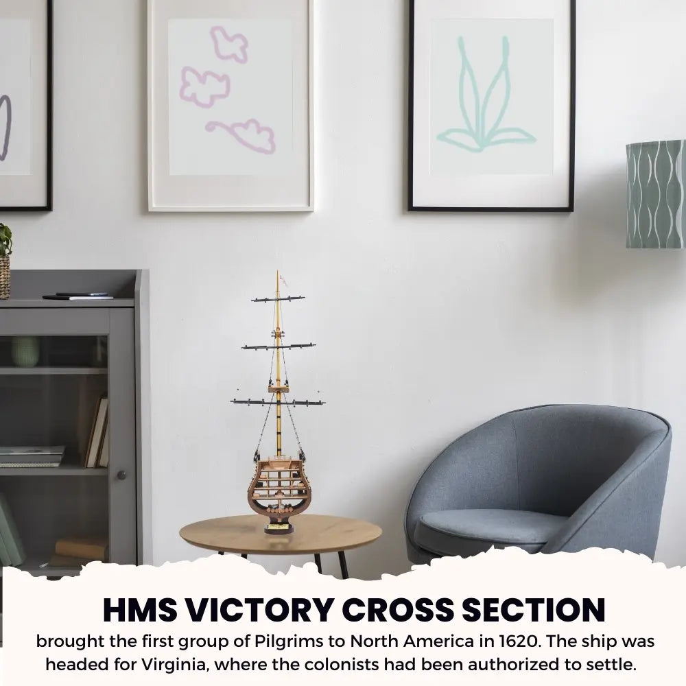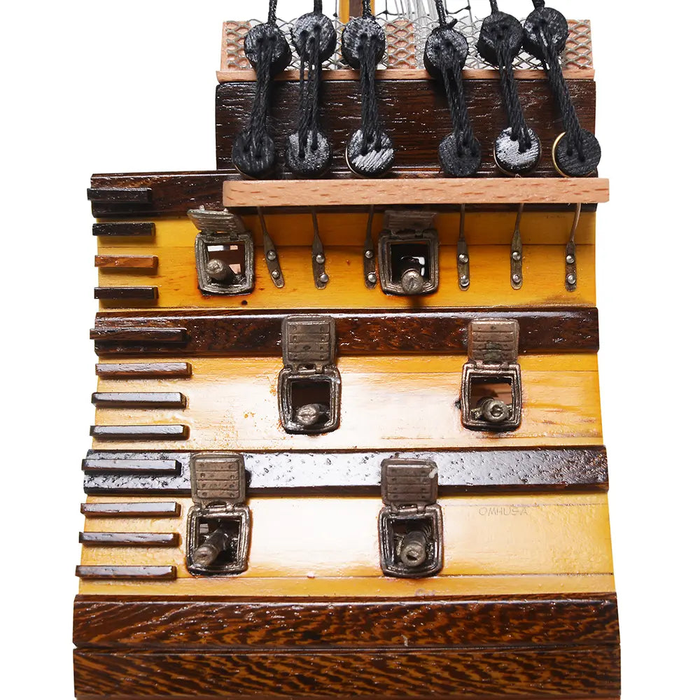 The HMS Victory Cross Section model captures the interior structure and deck arrangement of Britain’s most celebrated warship. Fully assembled and handcrafted from high-quality wood, this 35.25-inch tall model is built using traditional plank-on-frame construction. Skilled artisans dedicate over 50 hours to create each piece, featuring metal cannons, rigging, ladders, skylights, and a painted hull. Resting on a solid wooden base with a metal nameplate, it provides an authentic look into 18th-century shipbuilding craftsmanship. Ideal for collectors and maritime enthusiasts, this model combines historical significance with detailed artistry for a timeless display.