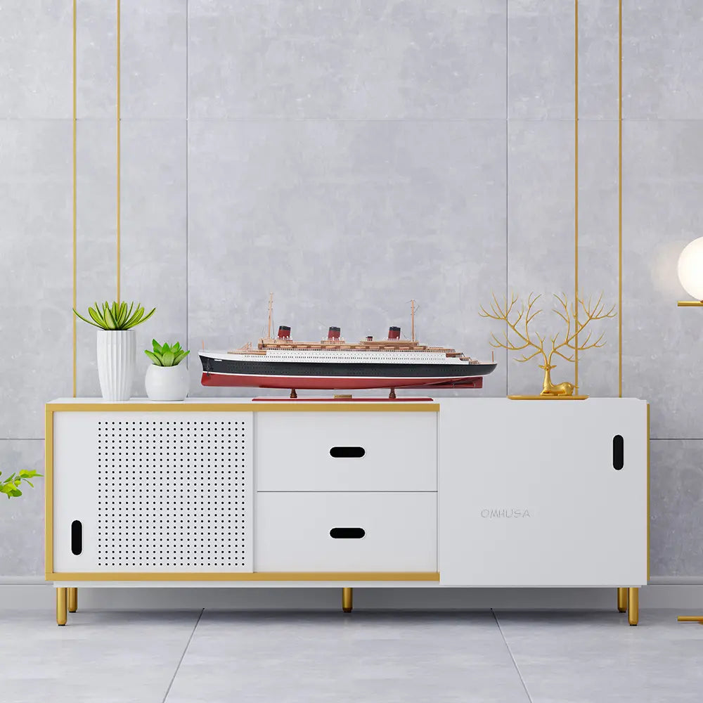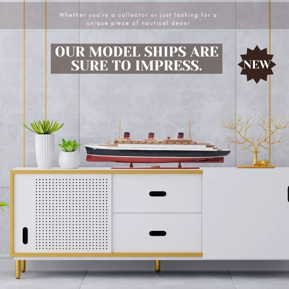 The Normandie Painted Large ship model is a handcrafted wooden replica of the famous French T.S.S. Normandie, measuring 14.5 inches tall. Built using the plank-on-frame method, this detailed model is made from high-grade woods such as western red cedar, rosewood, and mahogany. It features multiple decks, stanchions with guardrails, three painted smoke stacks, and dozens of lifeboats, all meticulously crafted by master artisans. Each model includes a unique laser-cut serial number on the brass nameplate. This collectible piece is perfect for boat enthusiasts, decorators, or passionate collectors.
