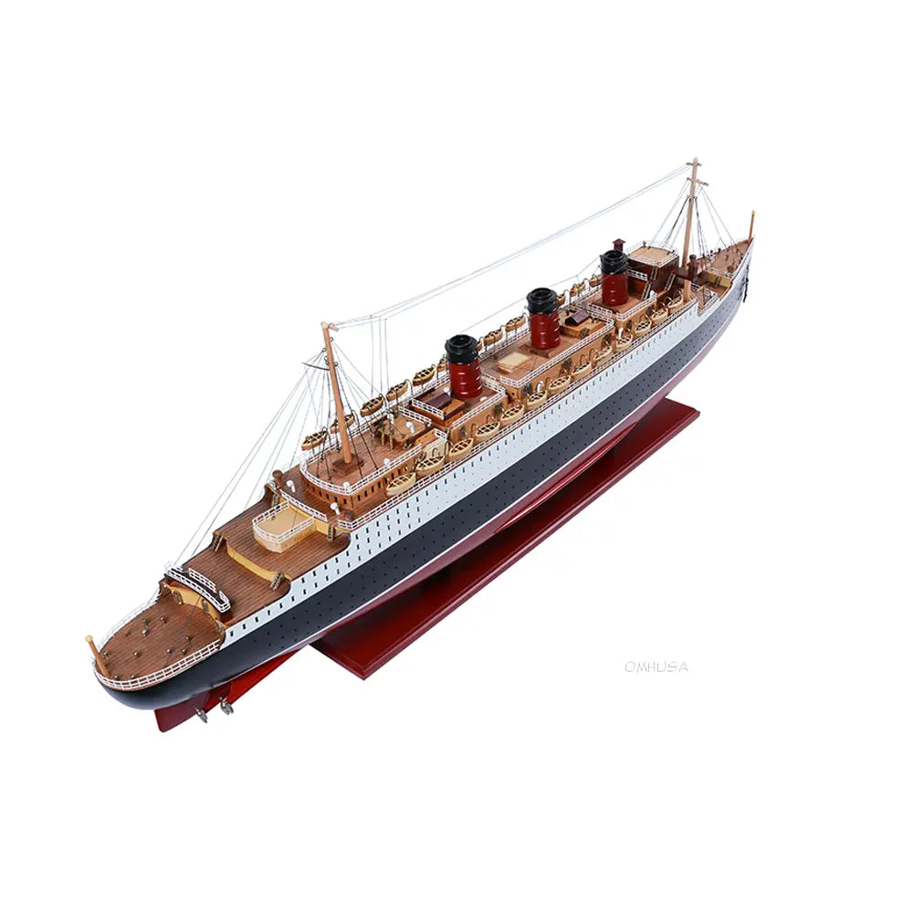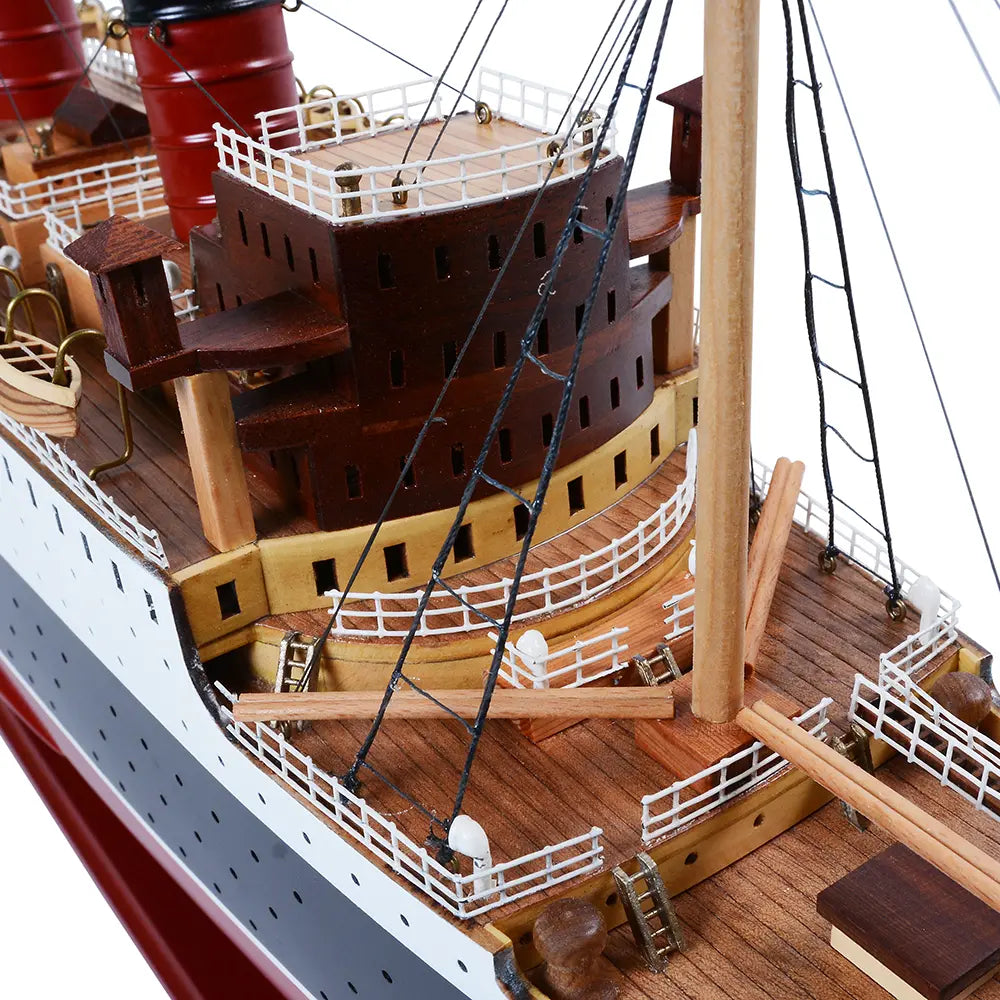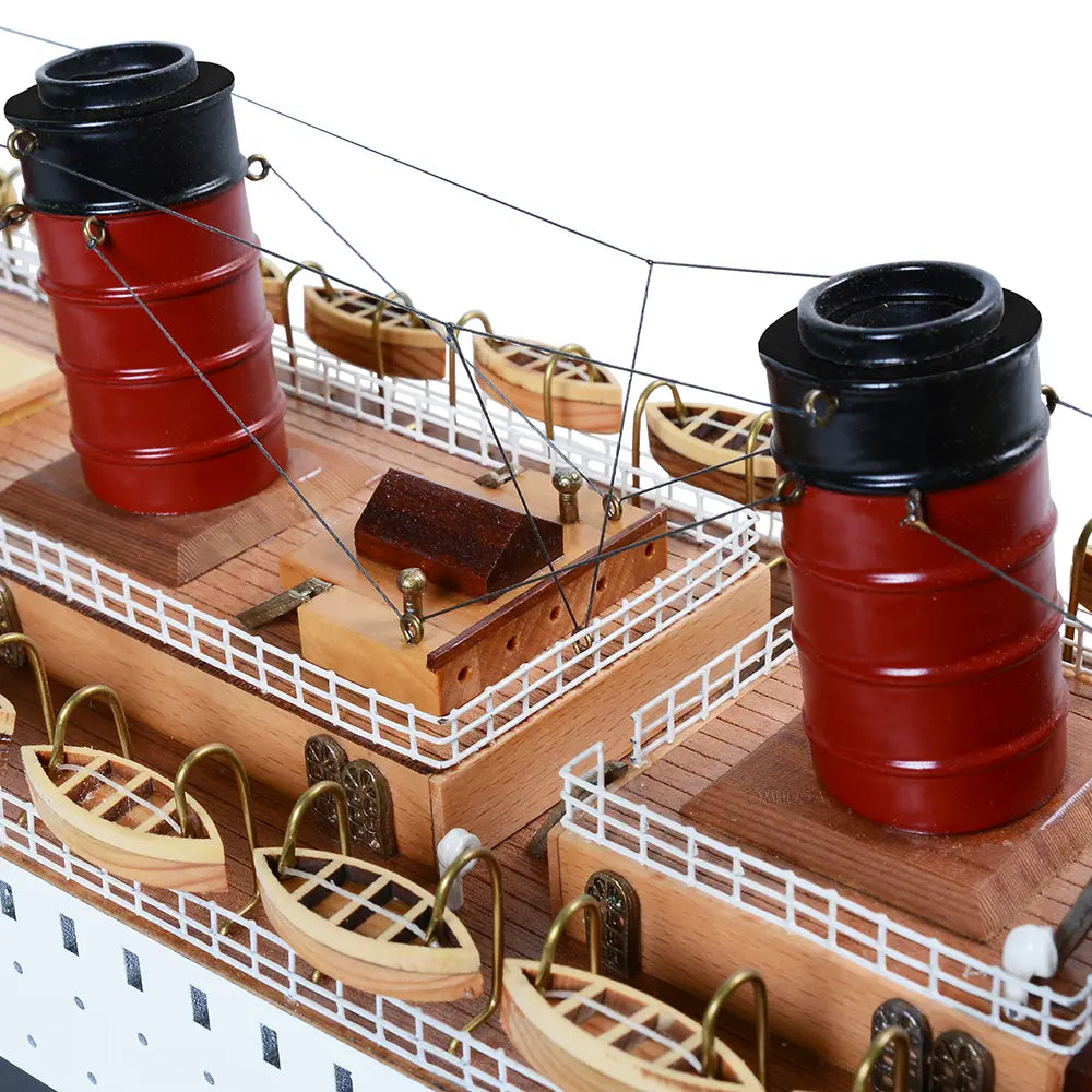 Built using the traditional plank-on-frame construction method, this piece is meticulously hand-assembled from scratch using fine wood components. It features painted red, white, and black detailing, three iconic smoke stacks, a dozen lifeboats on each side, brass doors and stairs, white-painted railings, and finely grained deck planks — no detail has been overlooked. Fully assembled and mounted on a wooden stand with a metal nameplate, this ship is a must-have showpiece for collectors, decorators, or history enthusiasts.