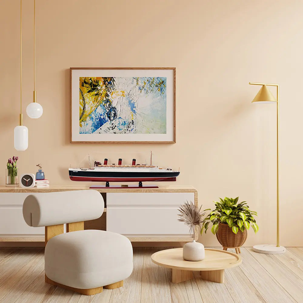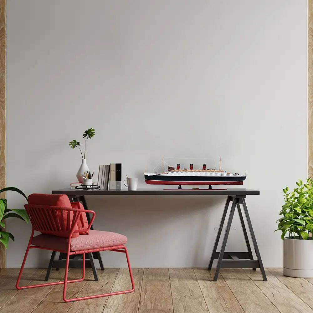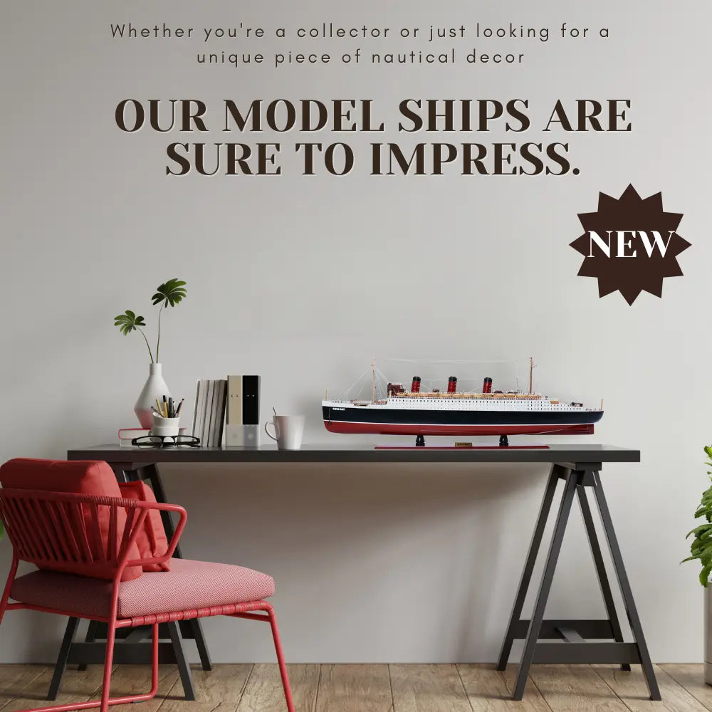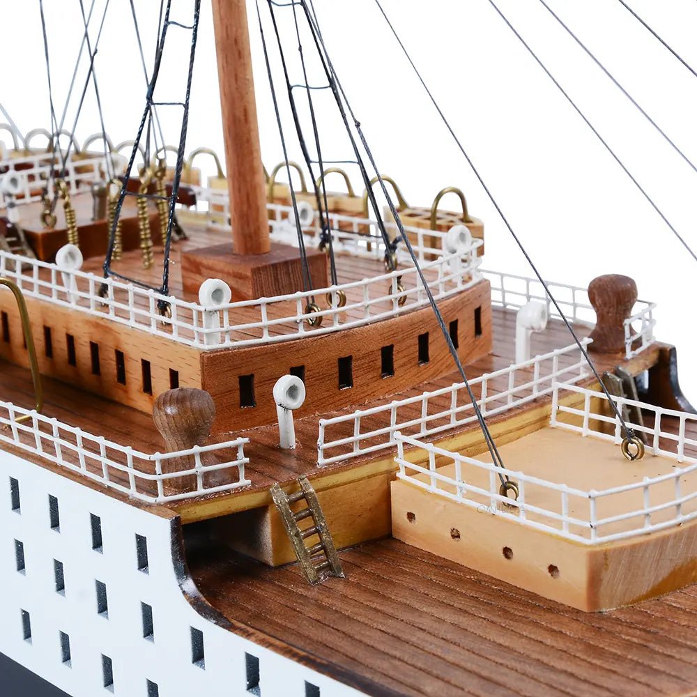 Built using the traditional plank-on-frame construction method, this piece is meticulously hand-assembled from scratch using fine wood components. It features painted red, white, and black detailing, three iconic smoke stacks, a dozen lifeboats on each side, brass doors and stairs, white-painted railings, and finely grained deck planks — no detail has been overlooked. Fully assembled and mounted on a wooden stand with a metal nameplate, this ship is a must-have showpiece for collectors, decorators, or history enthusiasts.