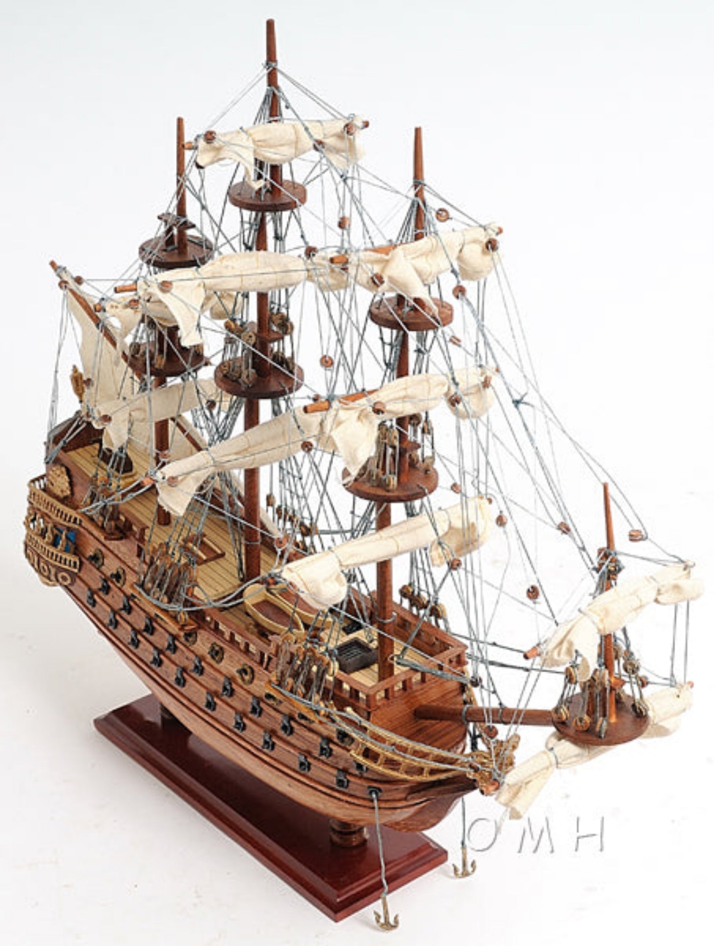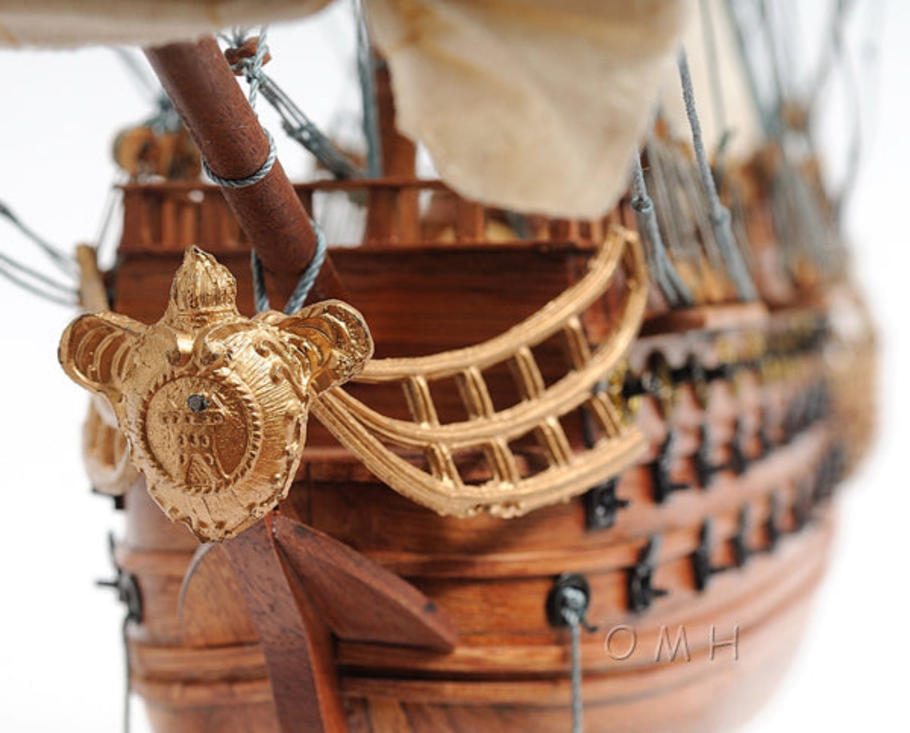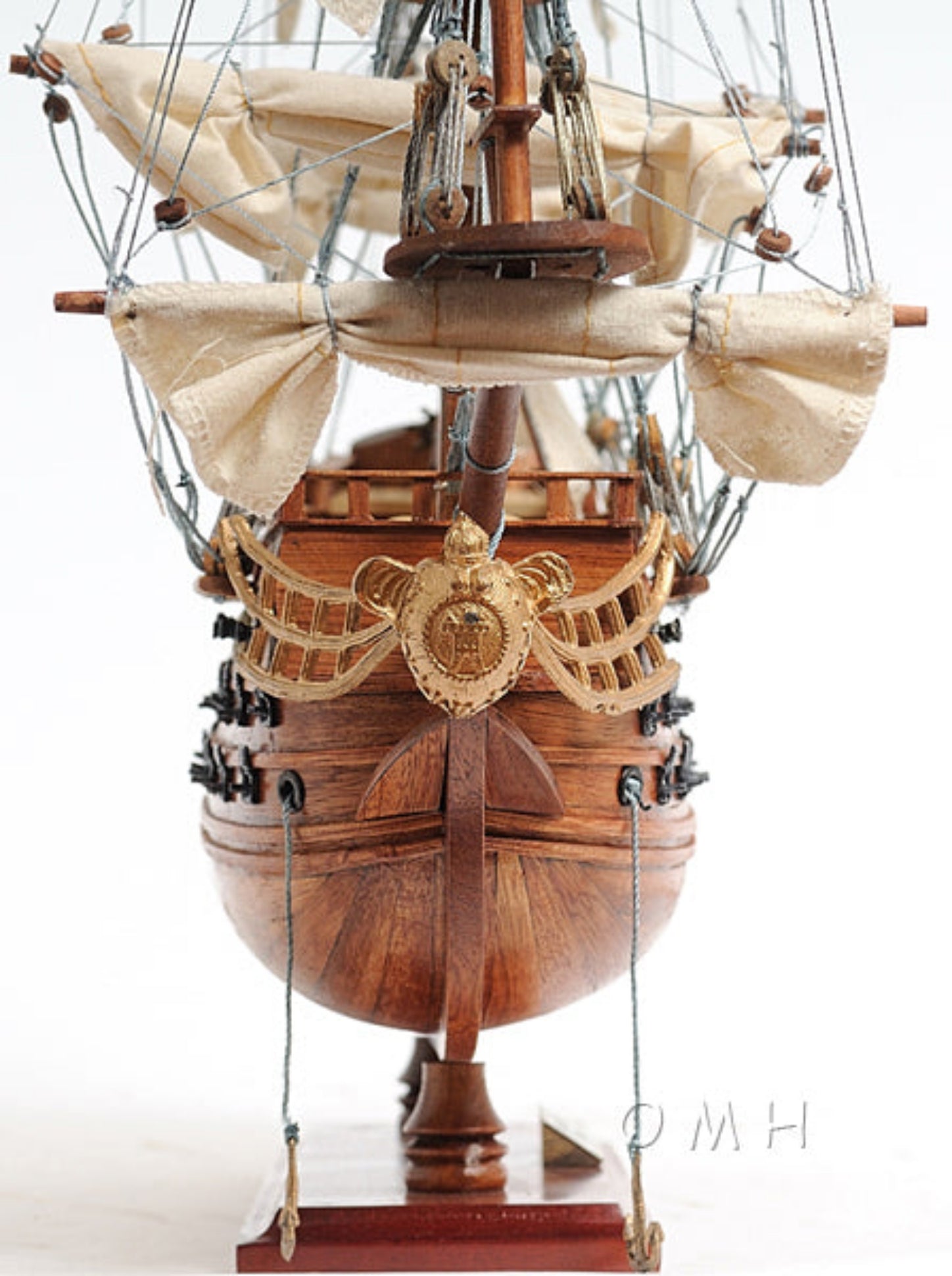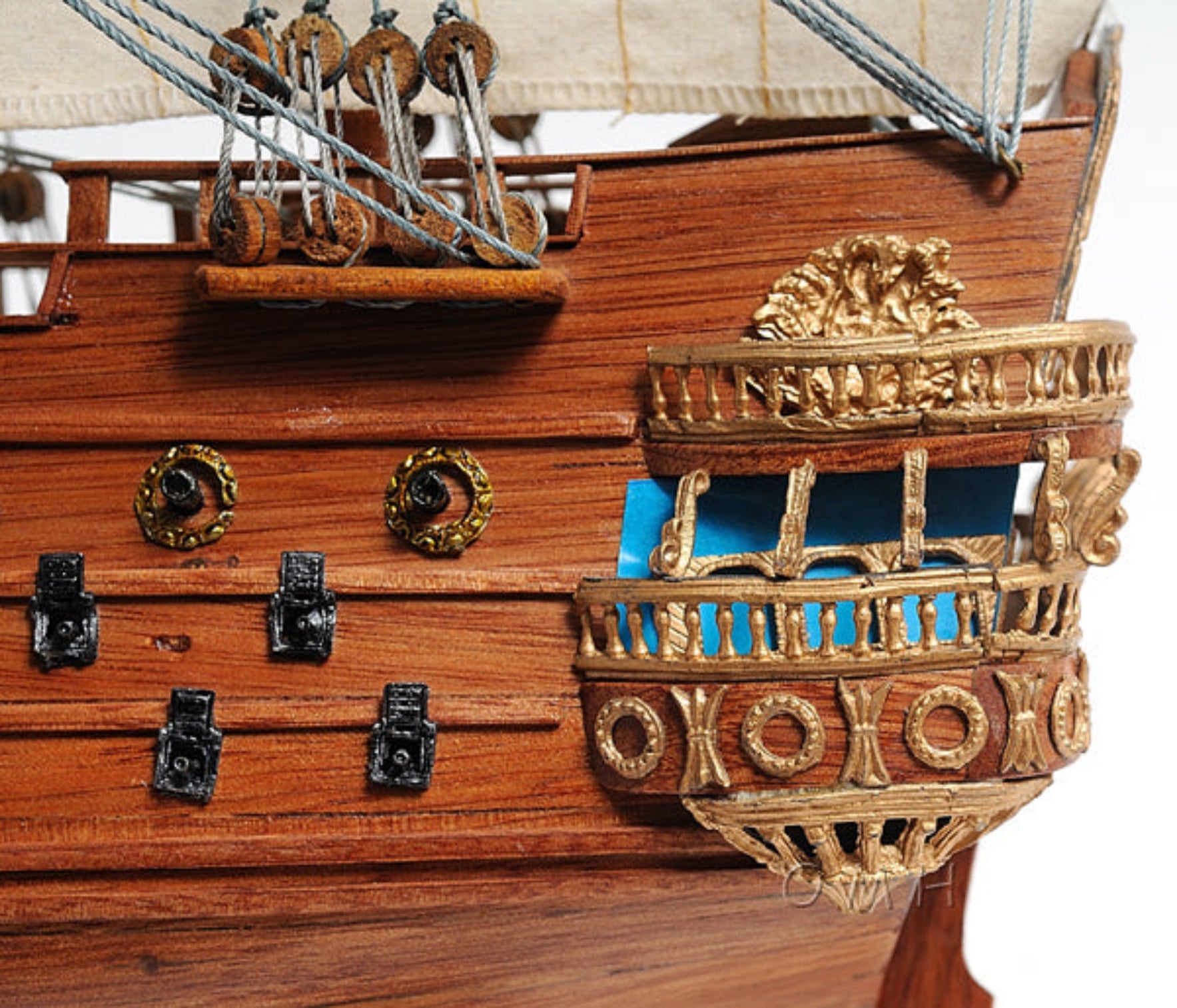 - Three rows of metal cannons, detailed rigging, and engraved nameplate
