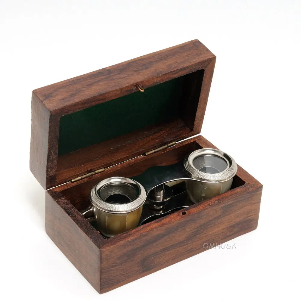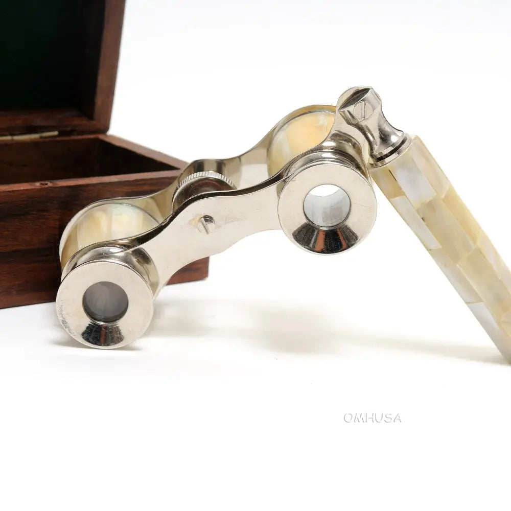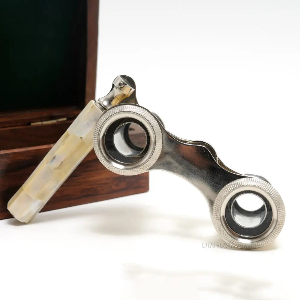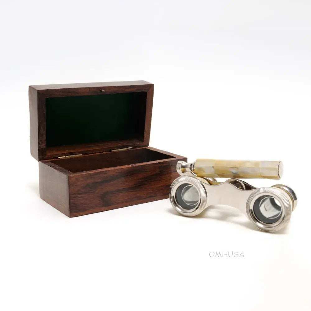 These brass opera glasses combine elegance and precision for an enhanced theater-viewing experience. Each pair is handcrafted from durable brass with a refined mother of pearl finish and nickel plating for a polished look. The design includes a telescopic handle for convenient use and display. Measuring 4 inches in length, 1.75 inches in width, and 1.25 inches in height, they offer approximately 8x magnification for clear and comfortable viewing. Packaged in a decorative wooden box, these compact opera glasses serve as a functional accessory for performances or a beautiful addition to any nautical or vintage collection.