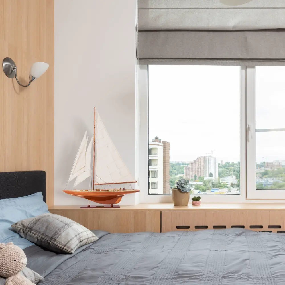 america cup sailboat replica,america cup yacht model,classic sailboat display,decorative yacht model,enterprise yacht replica,handcrafted ship model,handcrafted wooden ship,maritime collectible,maritime themed decor,nautical home decor,nautical office decor,small wooden sailboat,vintage boat model,wooden sailboat model,wooden yacht decoration